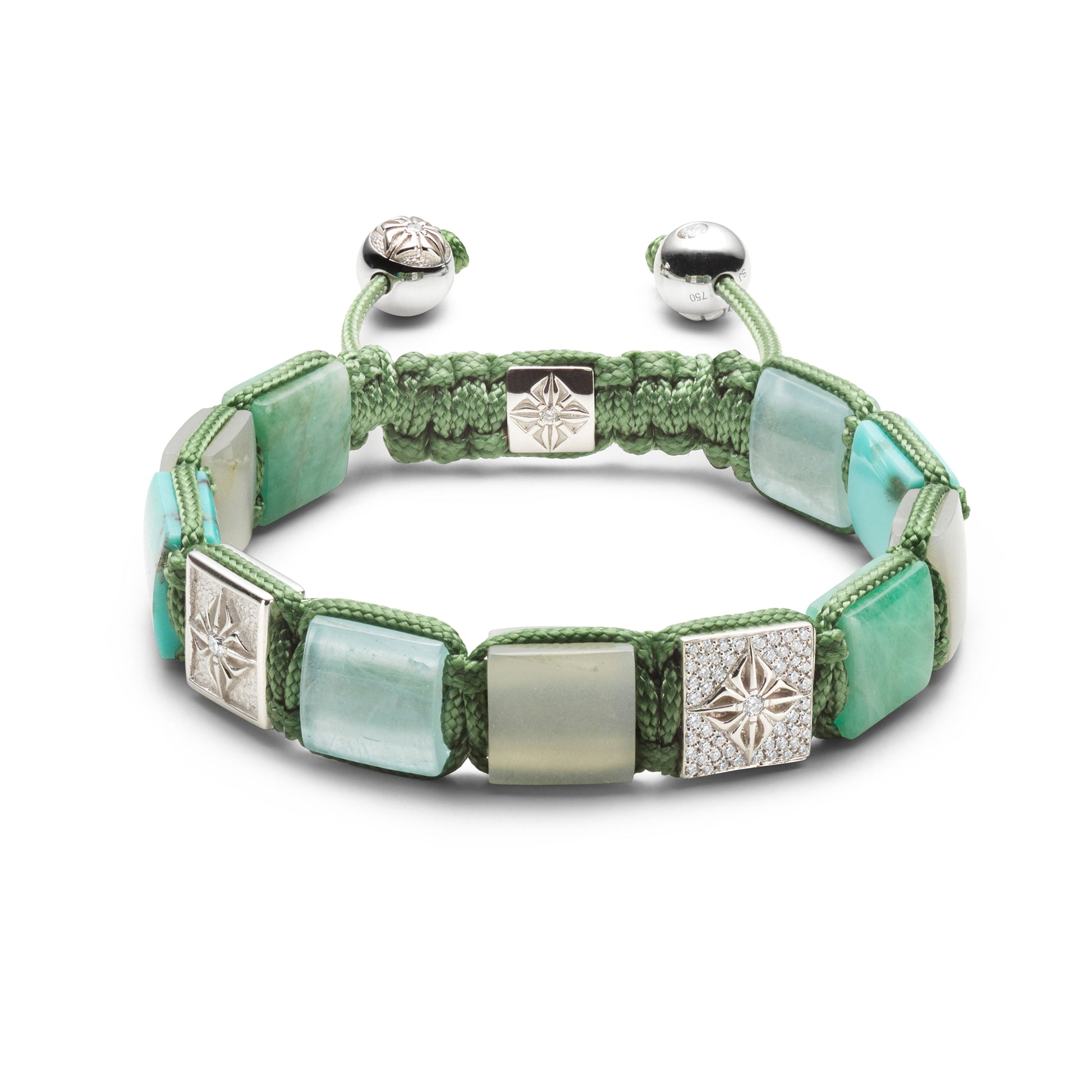 G/Vs Diamonds, Emeralds, Turquoises, Aquamarines, Moonstones, 18K White Gold.