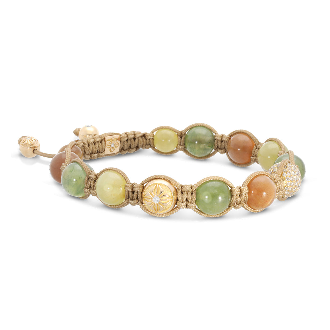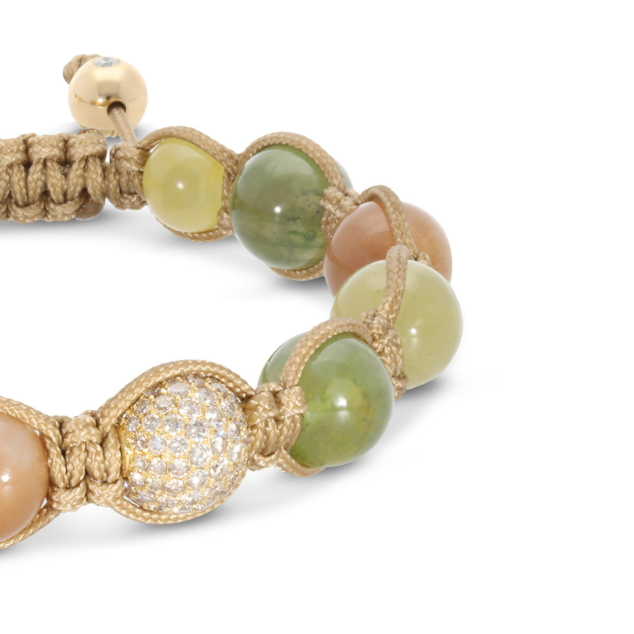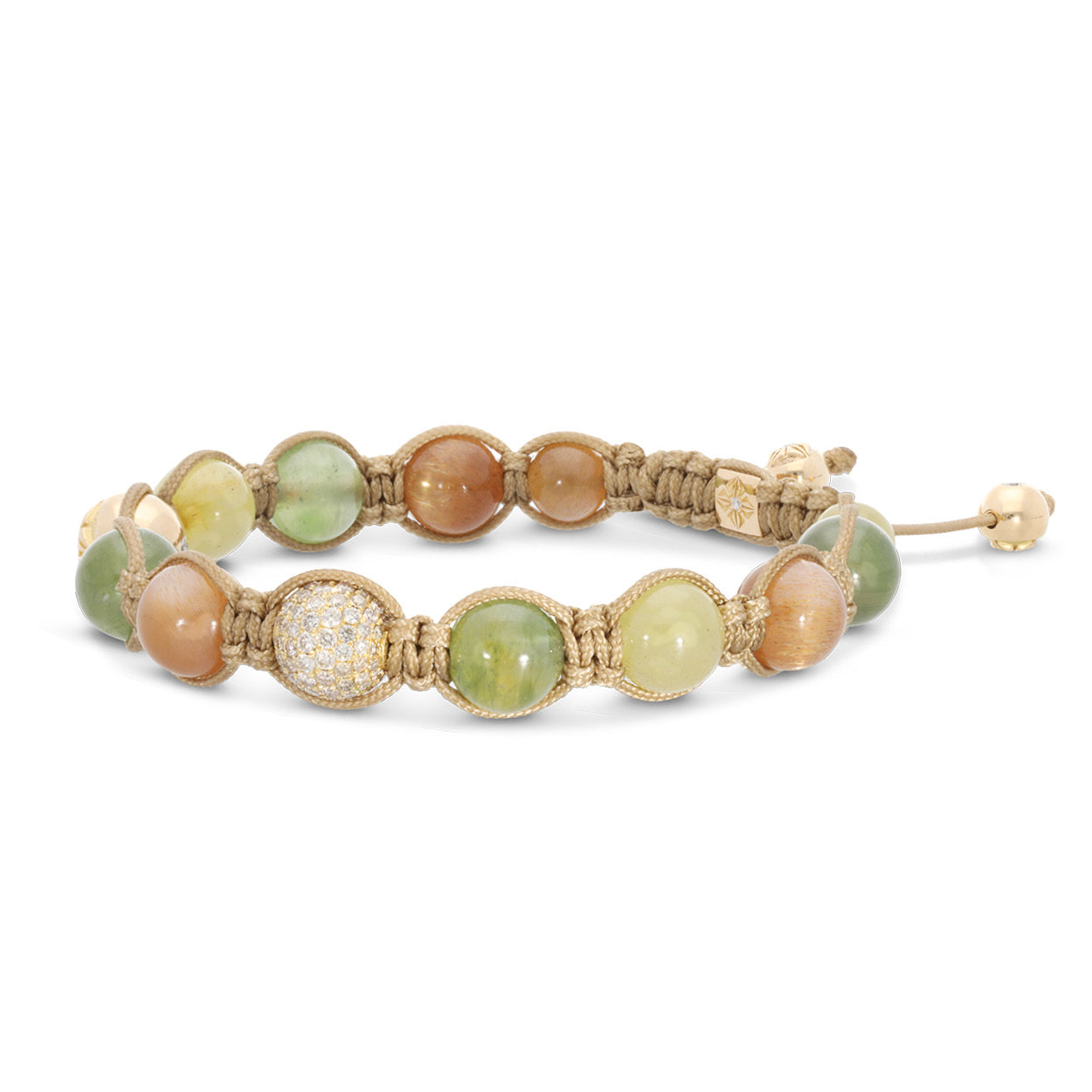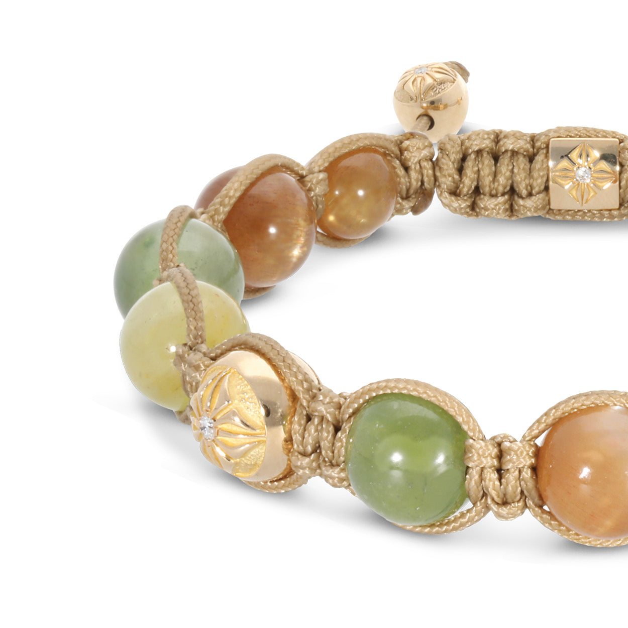 The 10mm SHAMBALLA® Braided Bracelet showcases a stunning combination of Brown & G/Vs Diamonds, Green & Yellow Sapphires, and Light Brown Moonstones, all set in luxurious 18K Yellow Gold. Finished with a Beige string, this bracelet exudes elegance and warmth, making it a refined statement piece.
