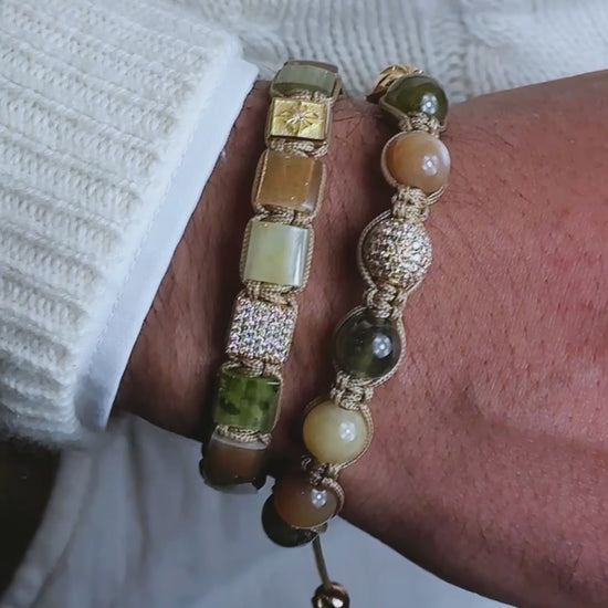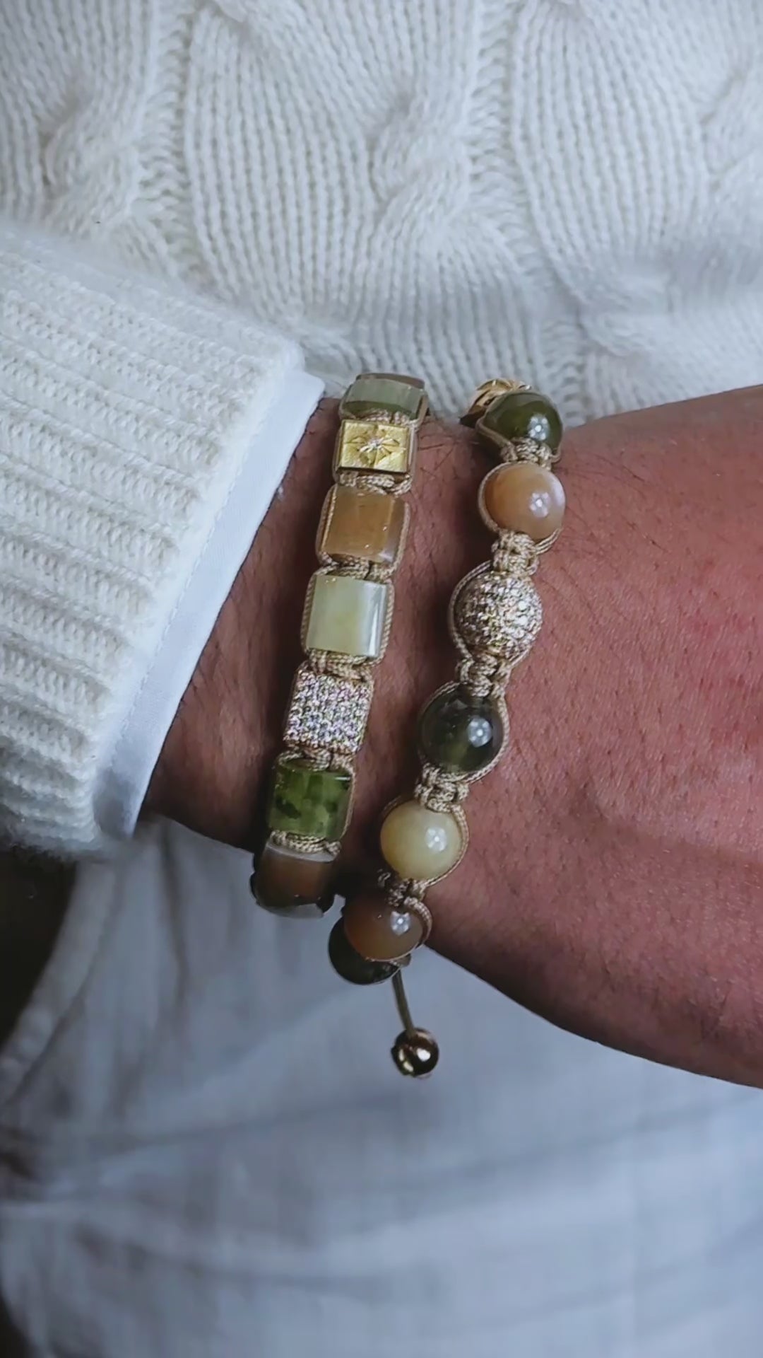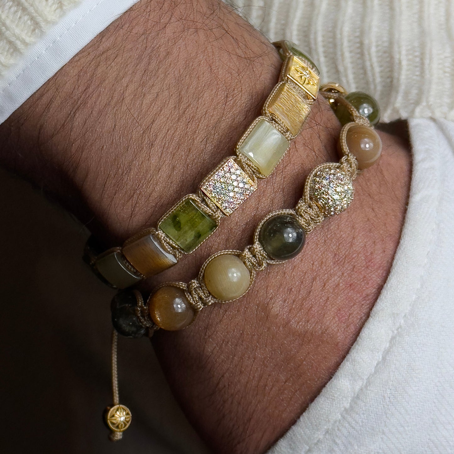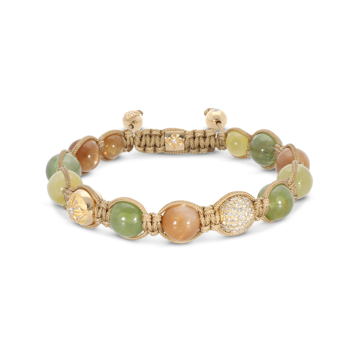 The 10mm SHAMBALLA® Braided Bracelet showcases a stunning combination of Brown & G/Vs Diamonds, Green & Yellow Sapphires, and Light Brown Moonstones, all set in luxurious 18K Yellow Gold. Finished with a Beige string, this bracelet exudes elegance and warmth, making it a refined statement piece.