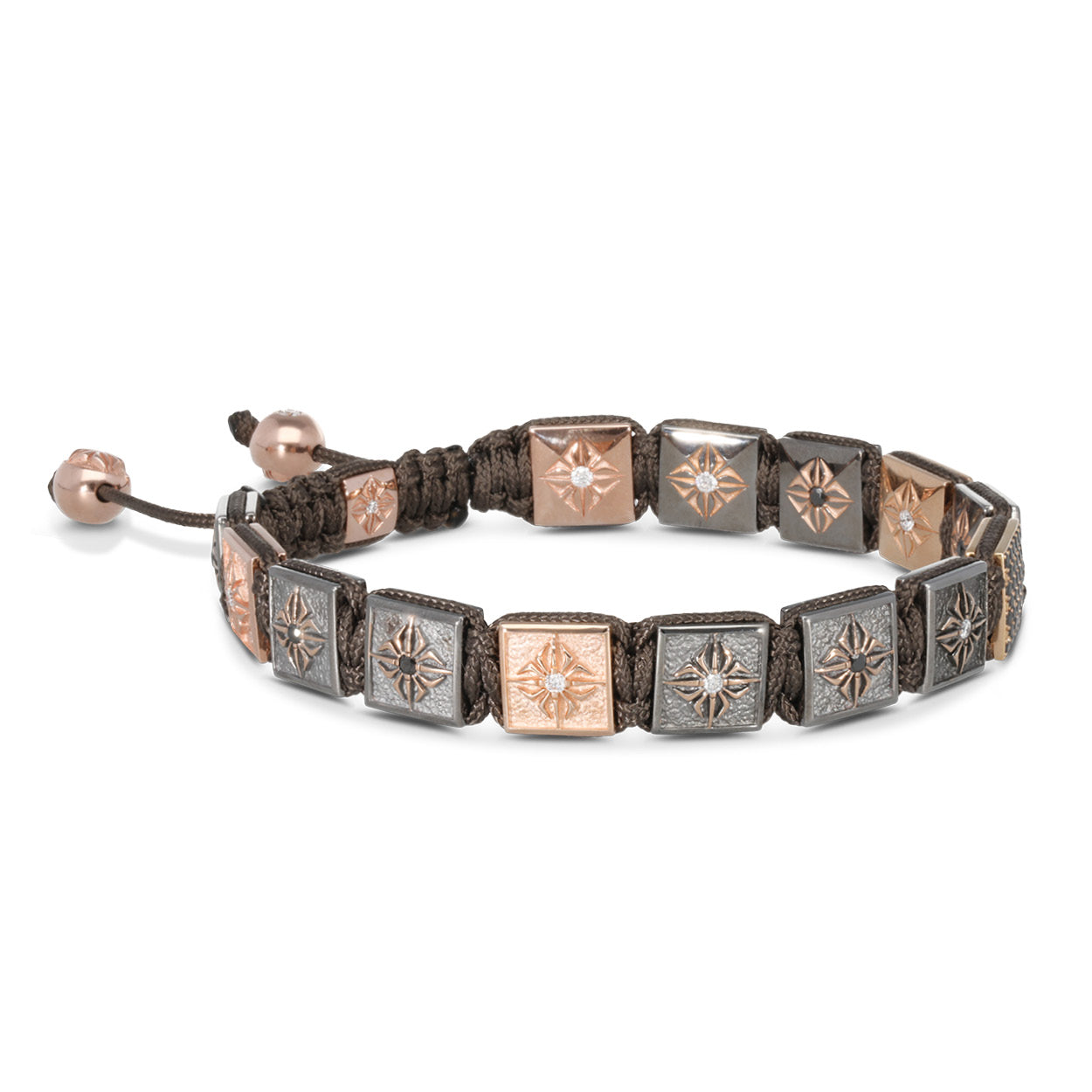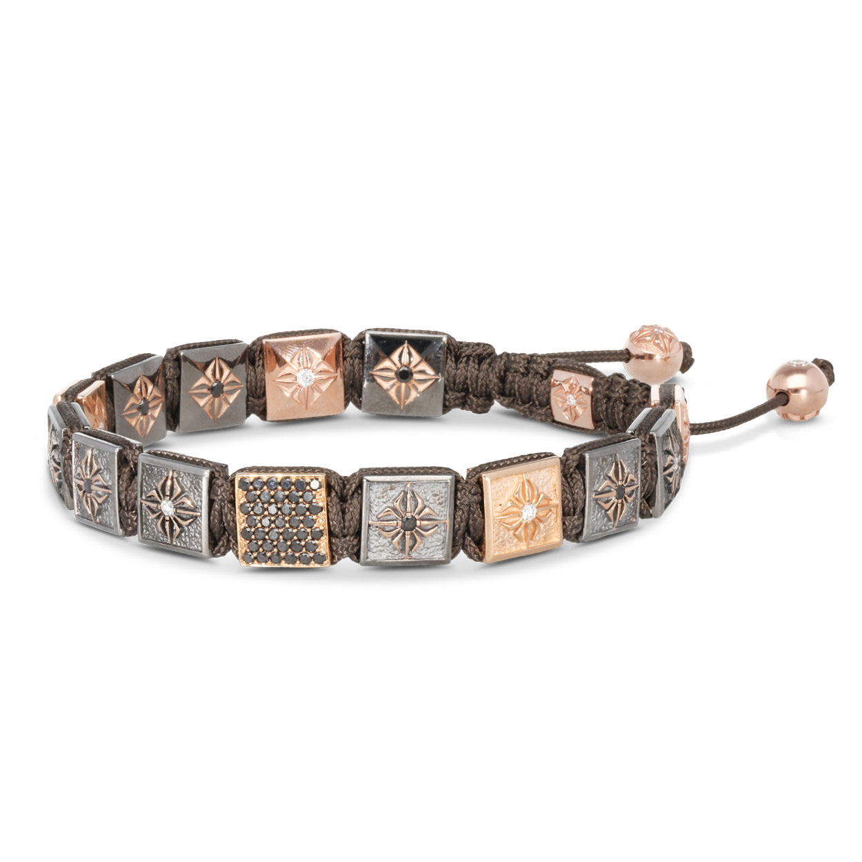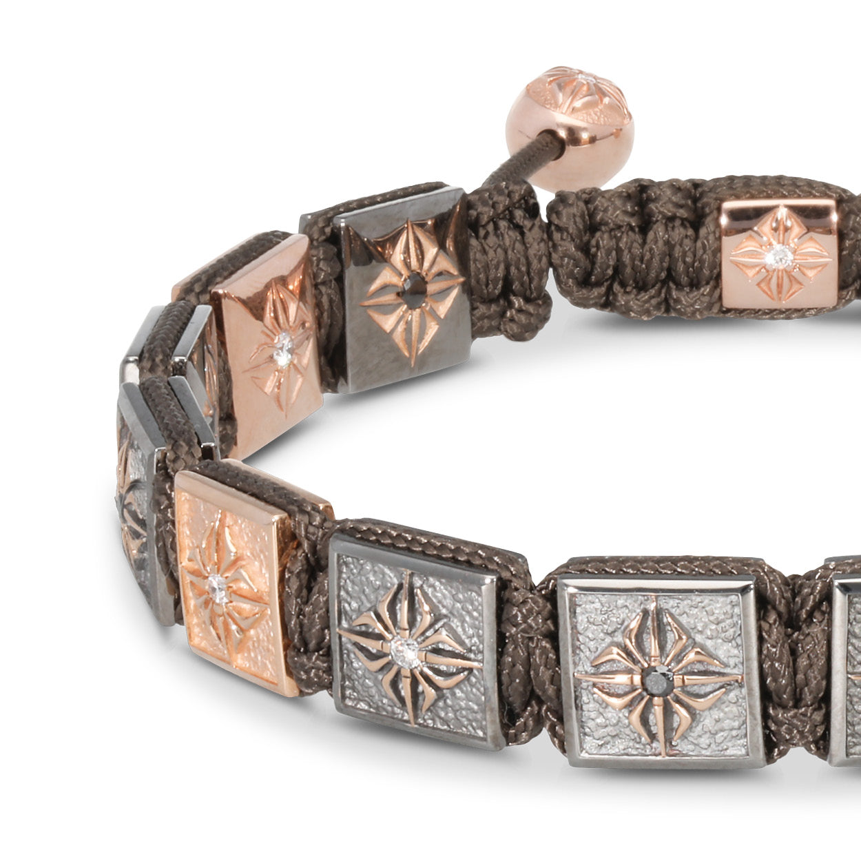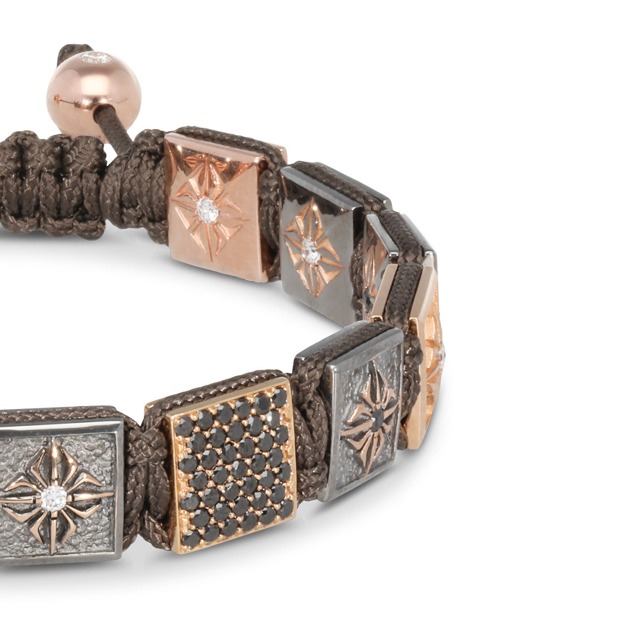 The 10mm SHAMBALLA® Lock Bracelet showcases a refined combination of G/Vs & Black Diamonds, set in luxurious 18K Rose & Black Rhodium Plated Rose Gold. Finished with a Dusty Brown string, this bracelet embodies timeless elegance and bold sophistication.