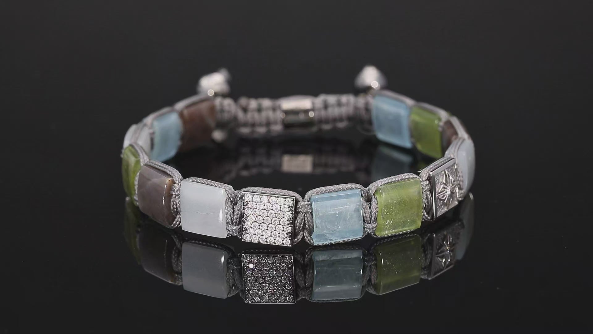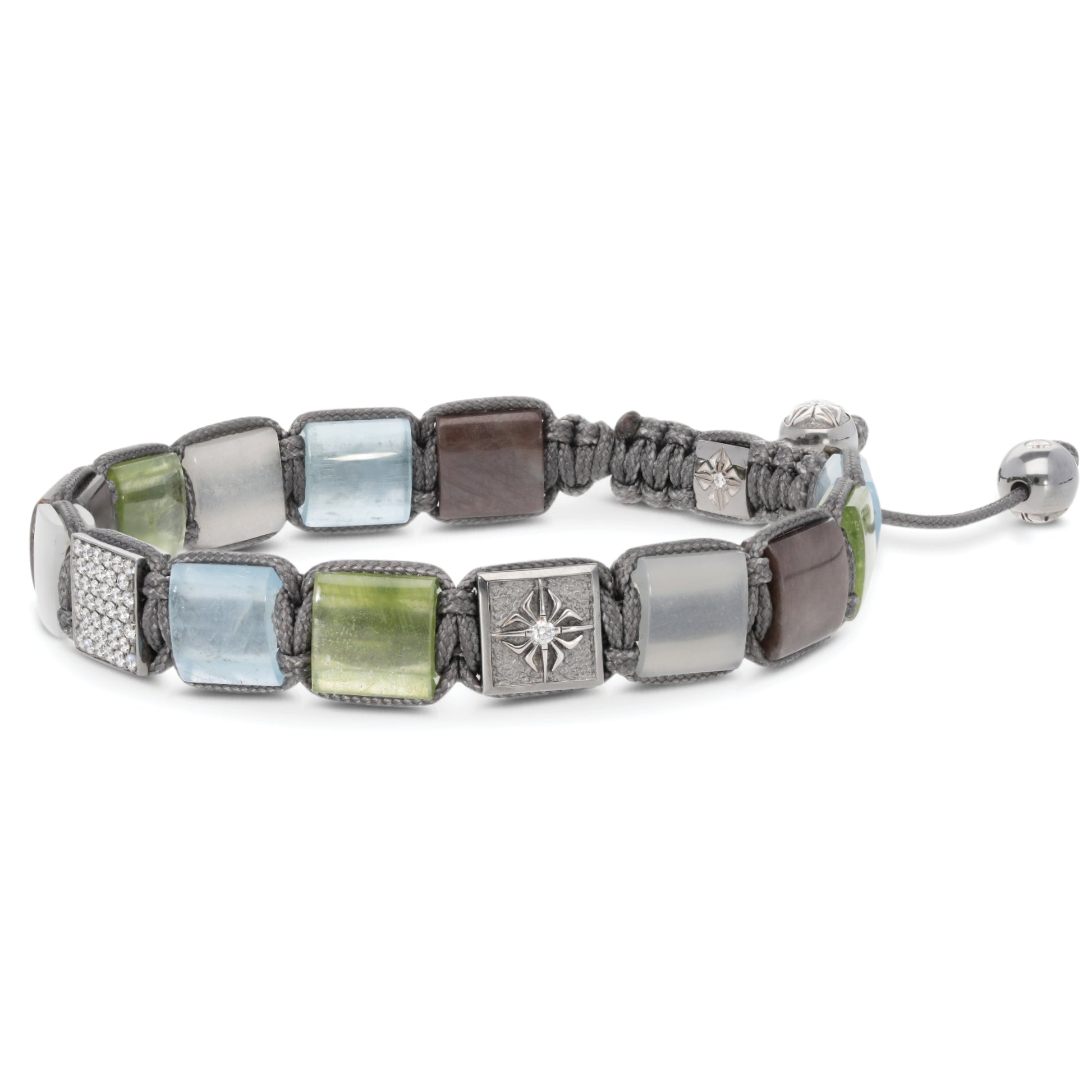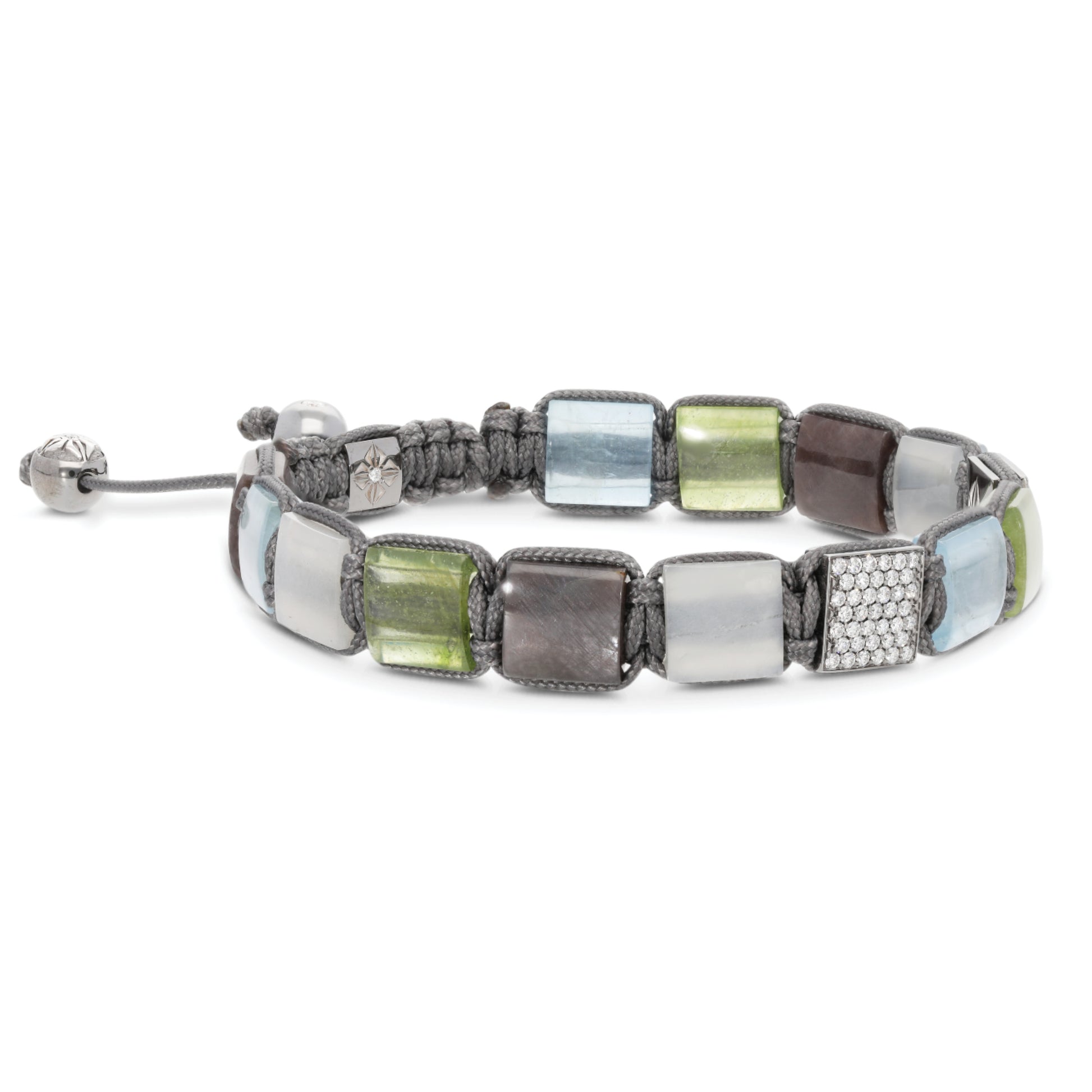 Expansive in presence and refined in tone, the 10mm SHAMBALLA® Lock Bracelet pairs white gold veiled in black rhodium with a cool, atmospheric palette. The oversized profile heightens contrast and texture: crisp G/Vs diamonds flash against the darkened metal, while green and grey sapphires, milky aquamarines, and moonstones move from misted glow to quiet shadow. Framed by a Stone Grey string, the silhouette feels modern and assured—striking on its own, effortless in a stack, and fully customizable in Creator.