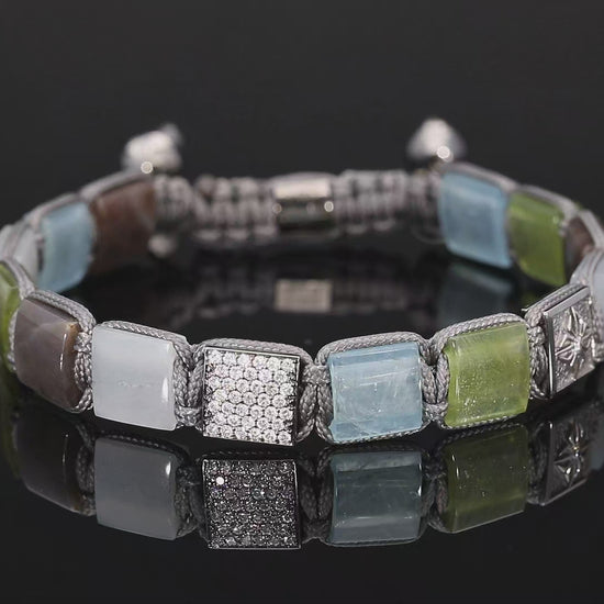 Velvety moonstones add a gentle adularescence, echoing the aquamarine’s calm luminosity and enriching the bracelet’s layered, cool-toned glow.