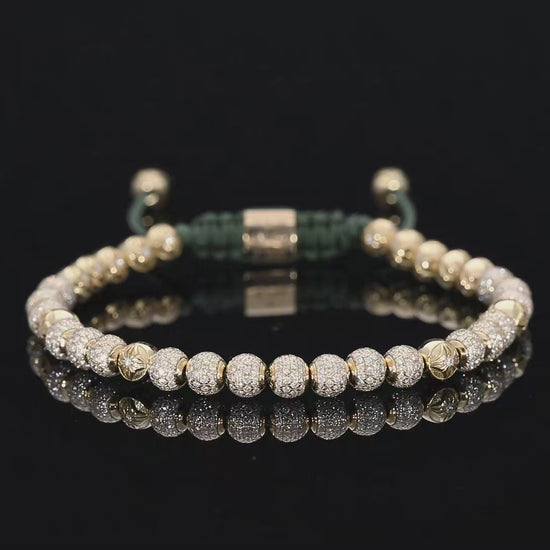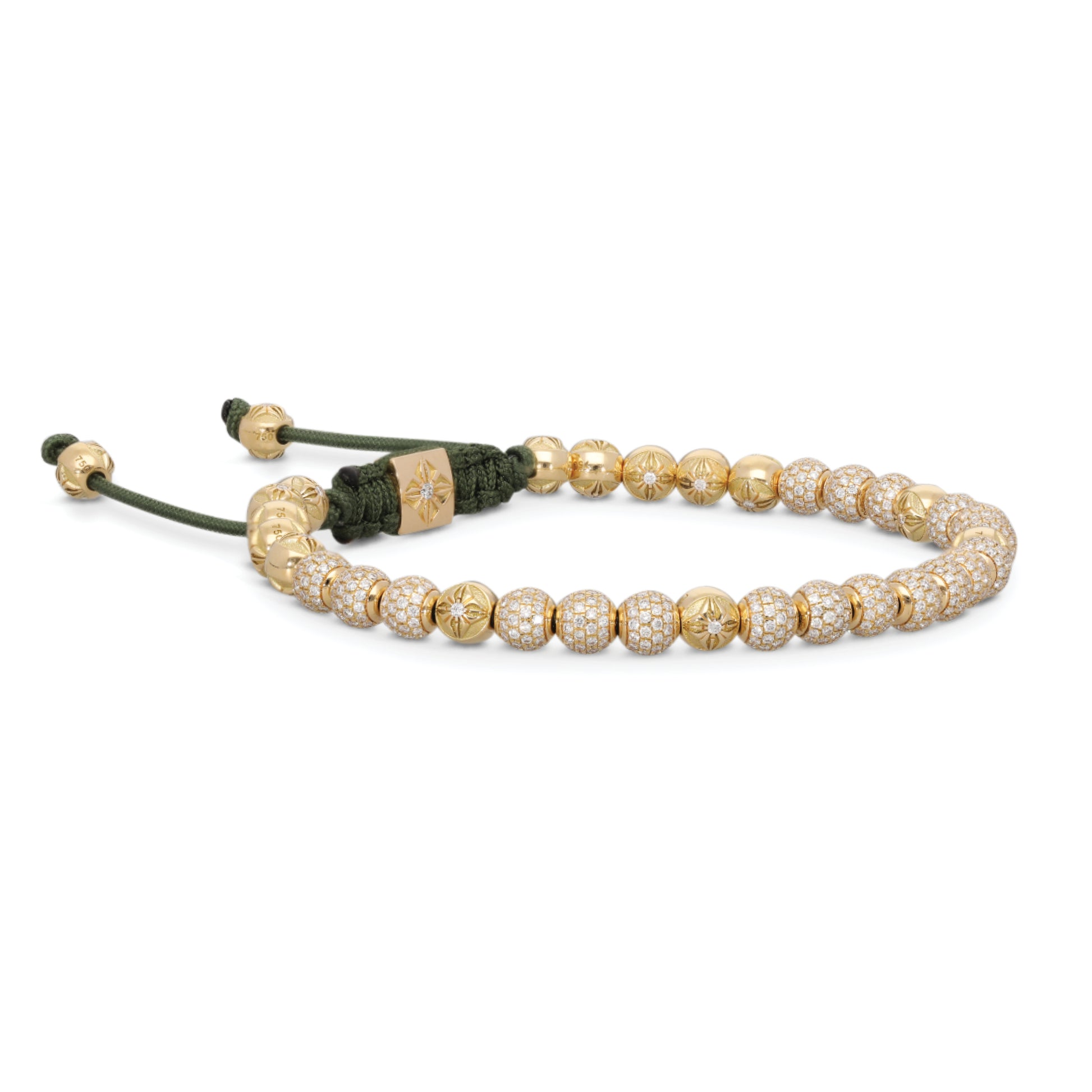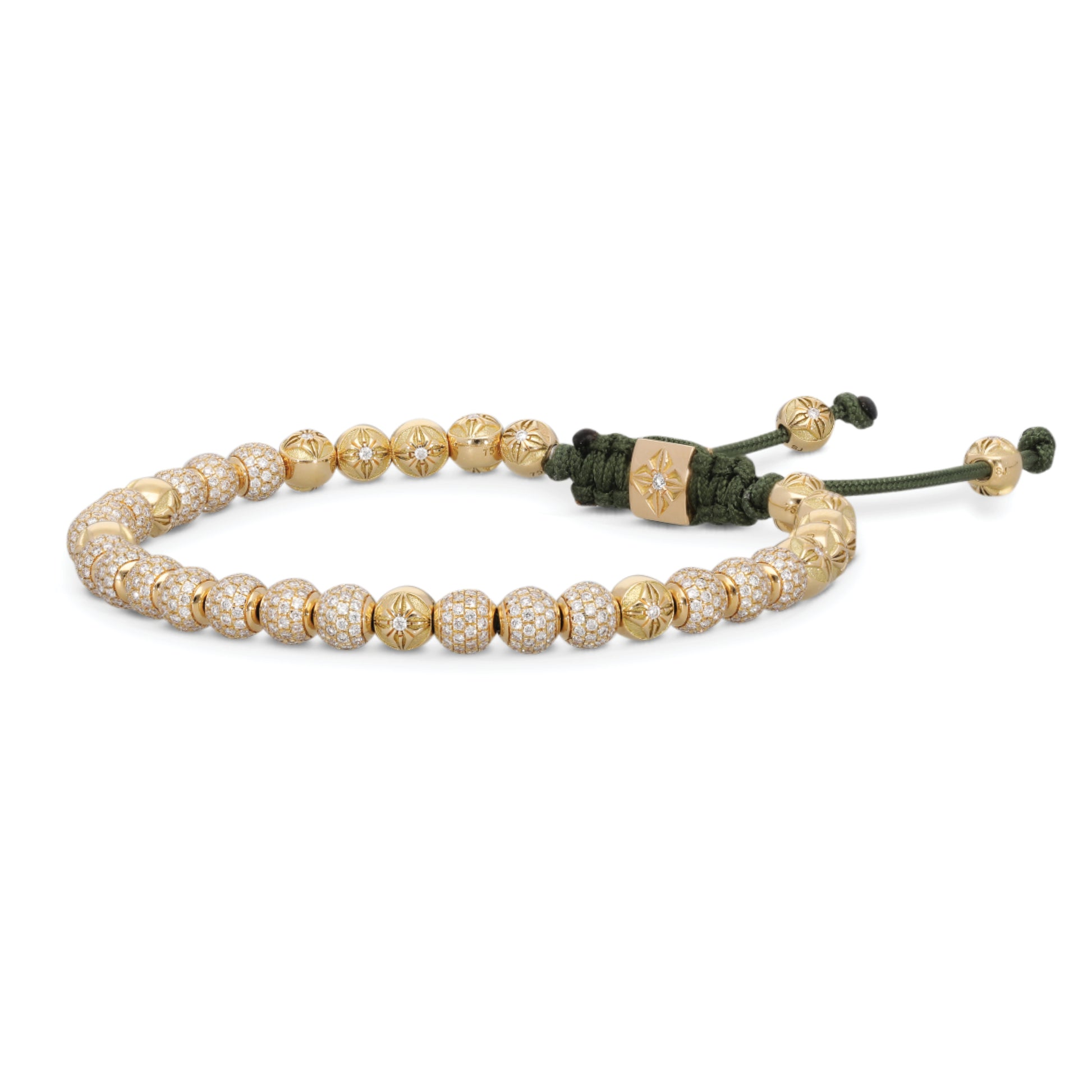 Slim, precise, and quietly radiant, the 4mm SHAMBALLA ® Non-Braided Bracelet distills the house aesthetic into a sleek, everyday silhouette. The refined 4mm profile sits close to the wrist with effortless ease, pairing the warmth of 18K yellow gold with the clean sparkle of G/Vs diamonds. An olive-colored string grounds the palette with a subtle, organic tone—understated on its own, striking in a stack.