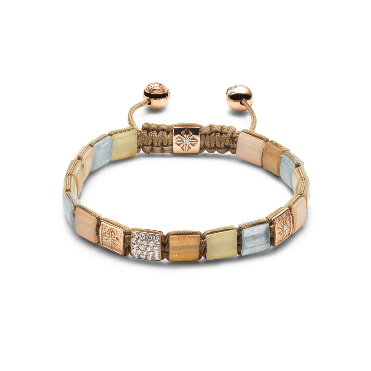 G/Vs Diamonds, Yellow Sapphires, Aquamarines, Peach & Light Brown Moonstones, 18K Rose Gold.