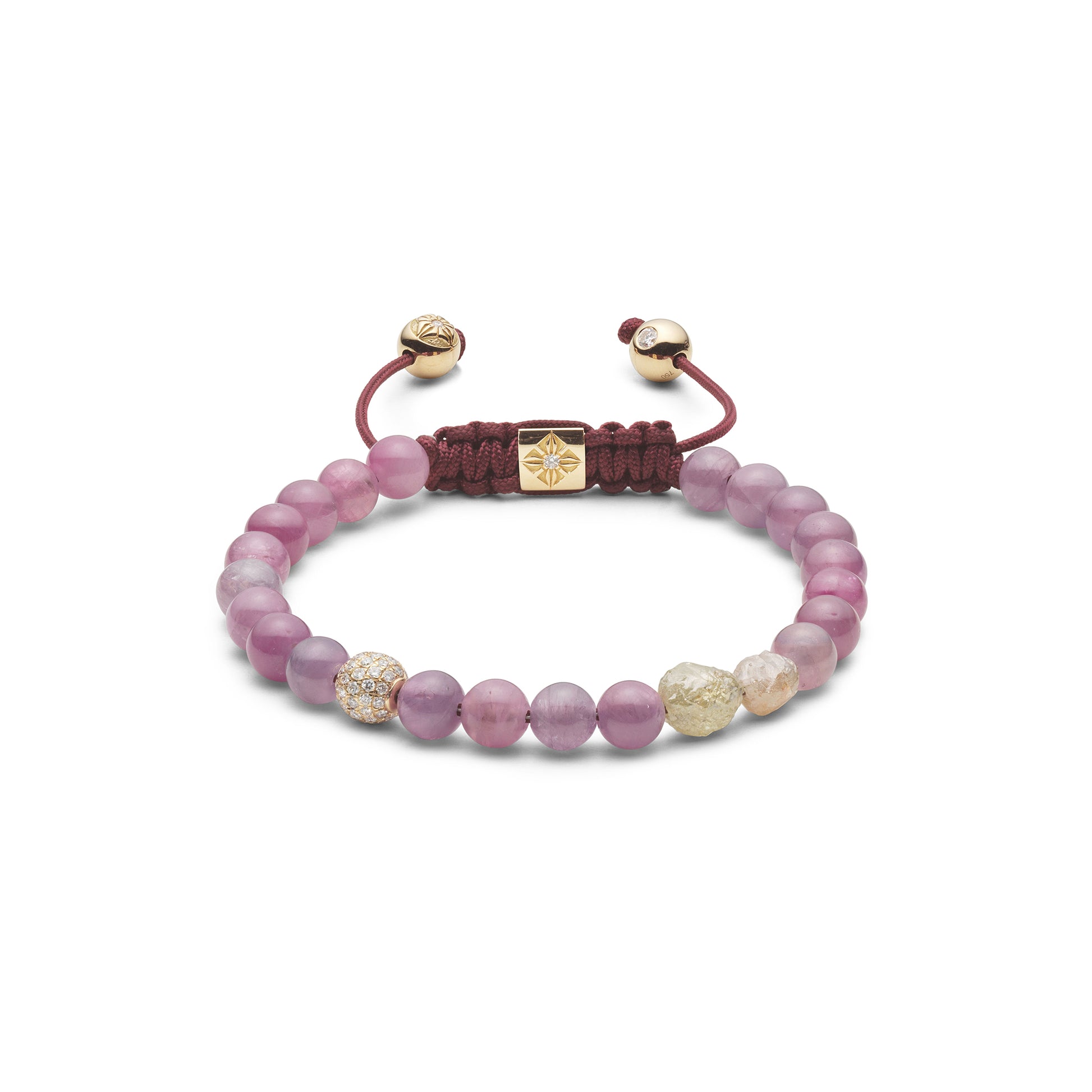 Rustic White Diamonds, G/Vs Diamonds, Pink Greenland Sapphires, 18K Yellow Gold. String: Ruby