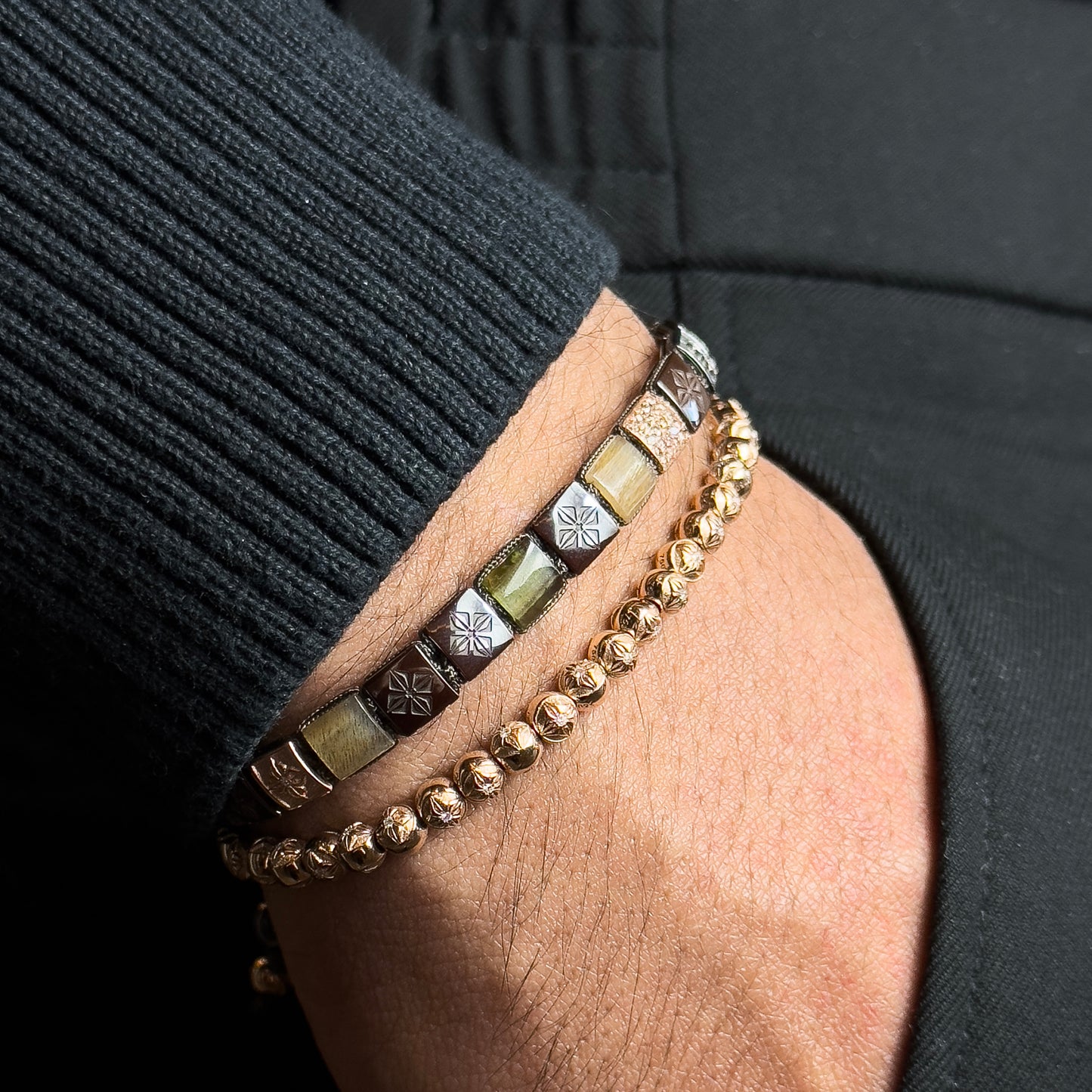Brown Ceramic – The brown ceramic elements add a modern, matte texture, providing contrast and enhancing the bracelet’s contemporary feel.