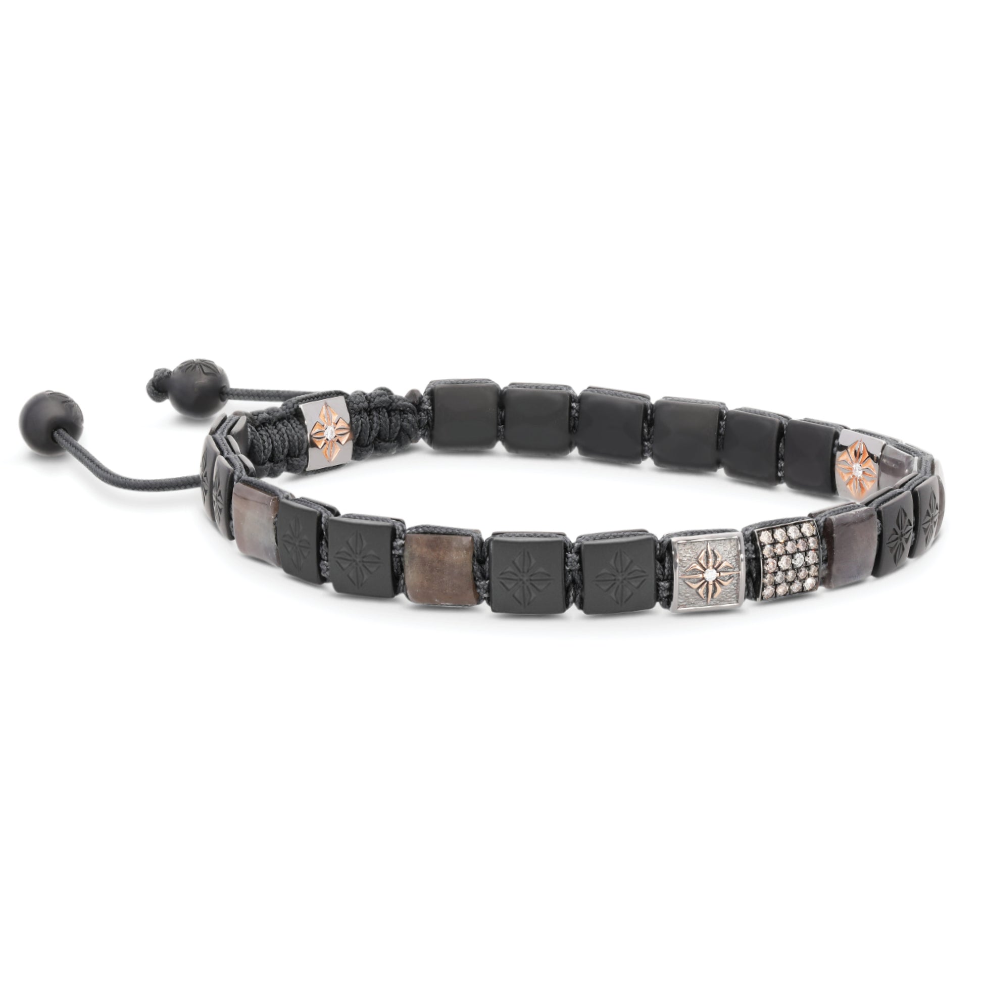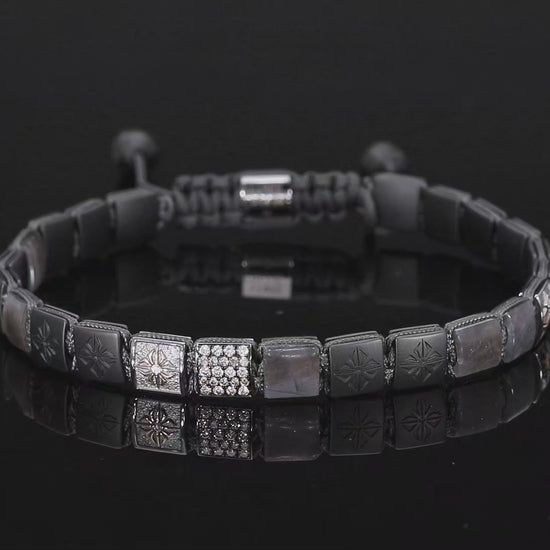 A durable, hand-braided string chosen for long-wear comfort and strength. Its Charcoal Grey tone is a color expression—not a metal—designed to echo the rhodium finish and refine the bracelet’s modern cadence.