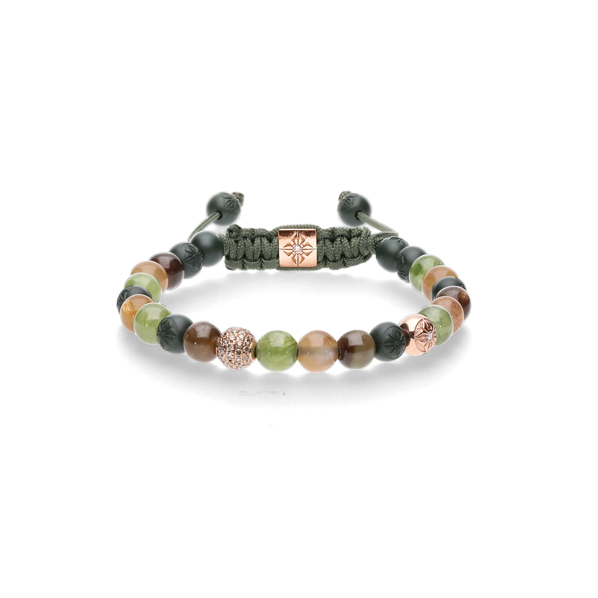 Brown and G/Vs Diamonds, Brown & Green Sapphires, Light Brown Moonstones, Green Matte Ceramics, 18K Rose Gold.