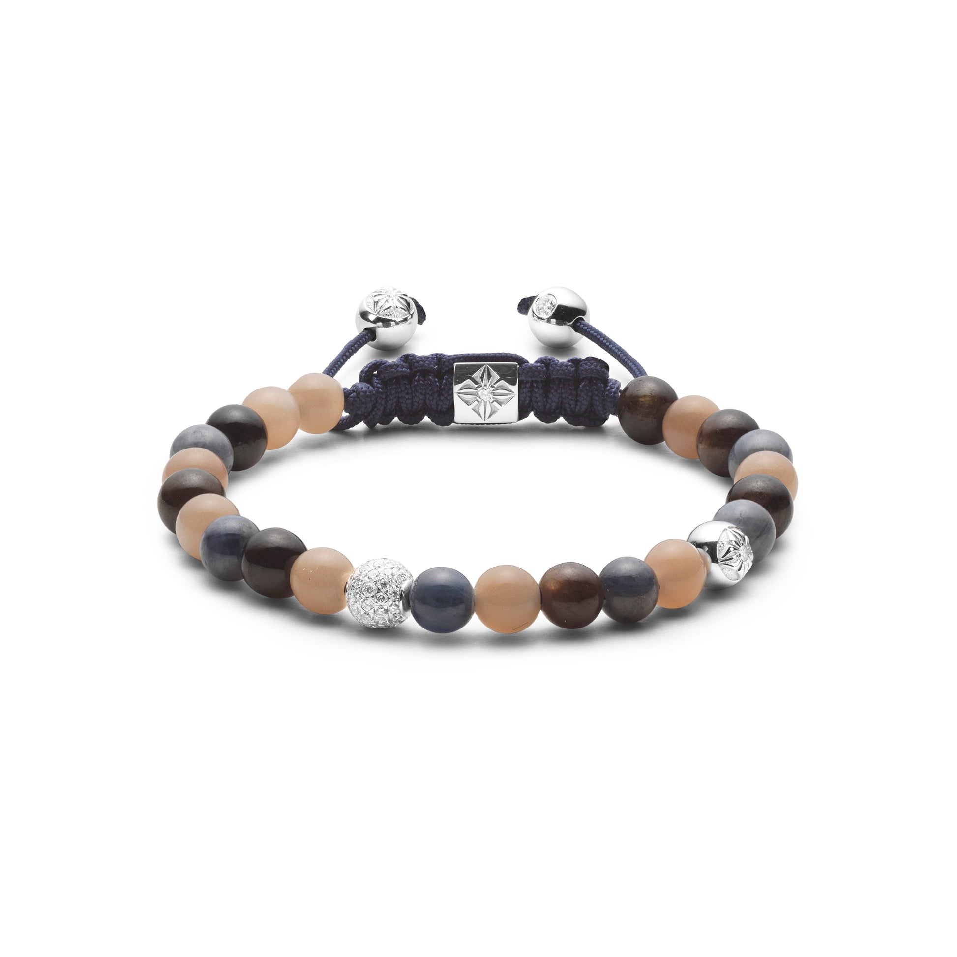 G/Vs Diamonds, Blue Greenland Sapphires, Brown Sapphires, Peach Moonstones, 18K White Gold.