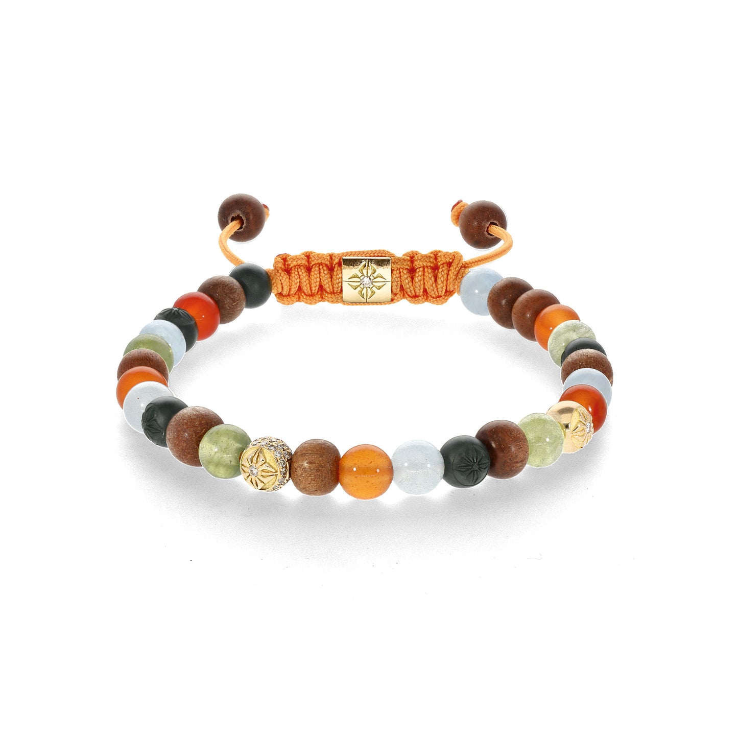 Brown & G/Vs Diamonds, Green Sapphires, Milky Aquamarines, Carnelians, Green Matte Ceramics, Light Ebonies, 18K Yellow Gold.