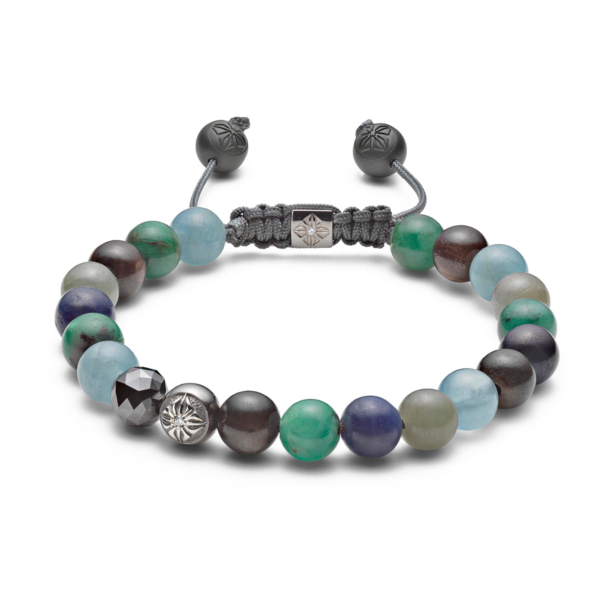 Introducing the 8mm Non-Braided Bracelet from Shamballa Jewels, a sophisticated blend of luxurious materials and contemporary design. This exquisite bracelet features a faceted black diamond, G/VS diamonds, blue, brown, and green sapphires, emeralds, and green matte ceramic, all set in 18K black rhodium-plated white gold. It is a captivating accessory that adds elegance and a touch of vibrant beauty to any ensemble.
