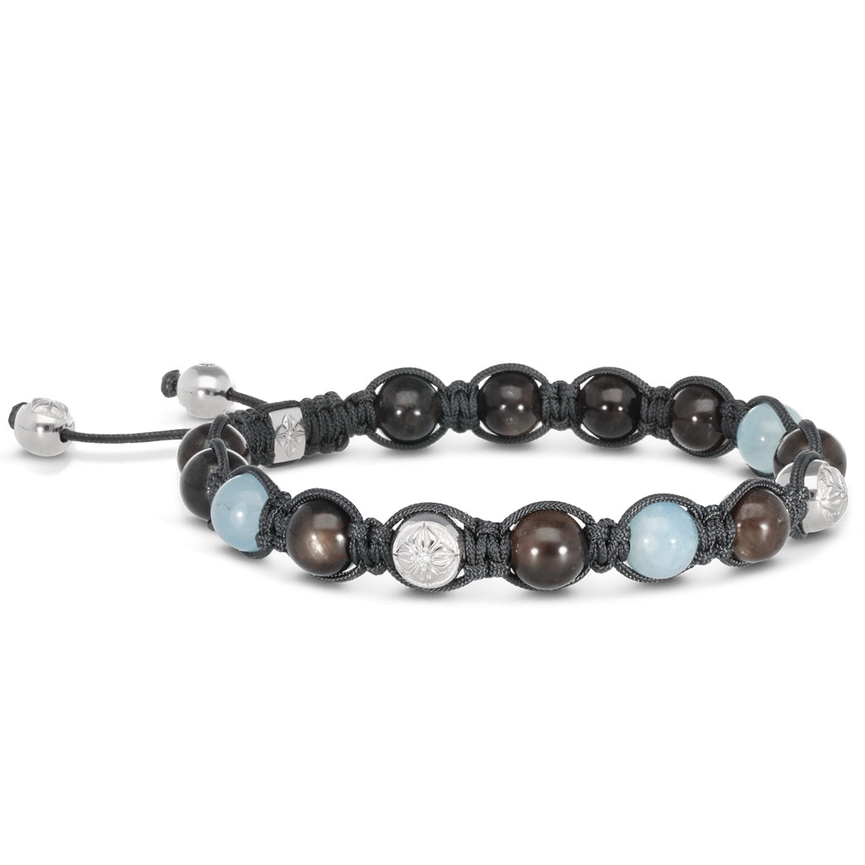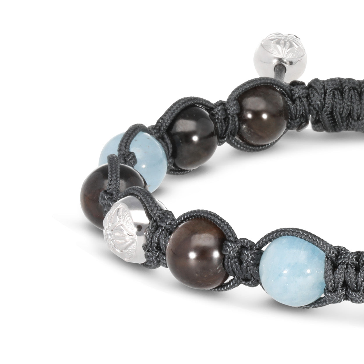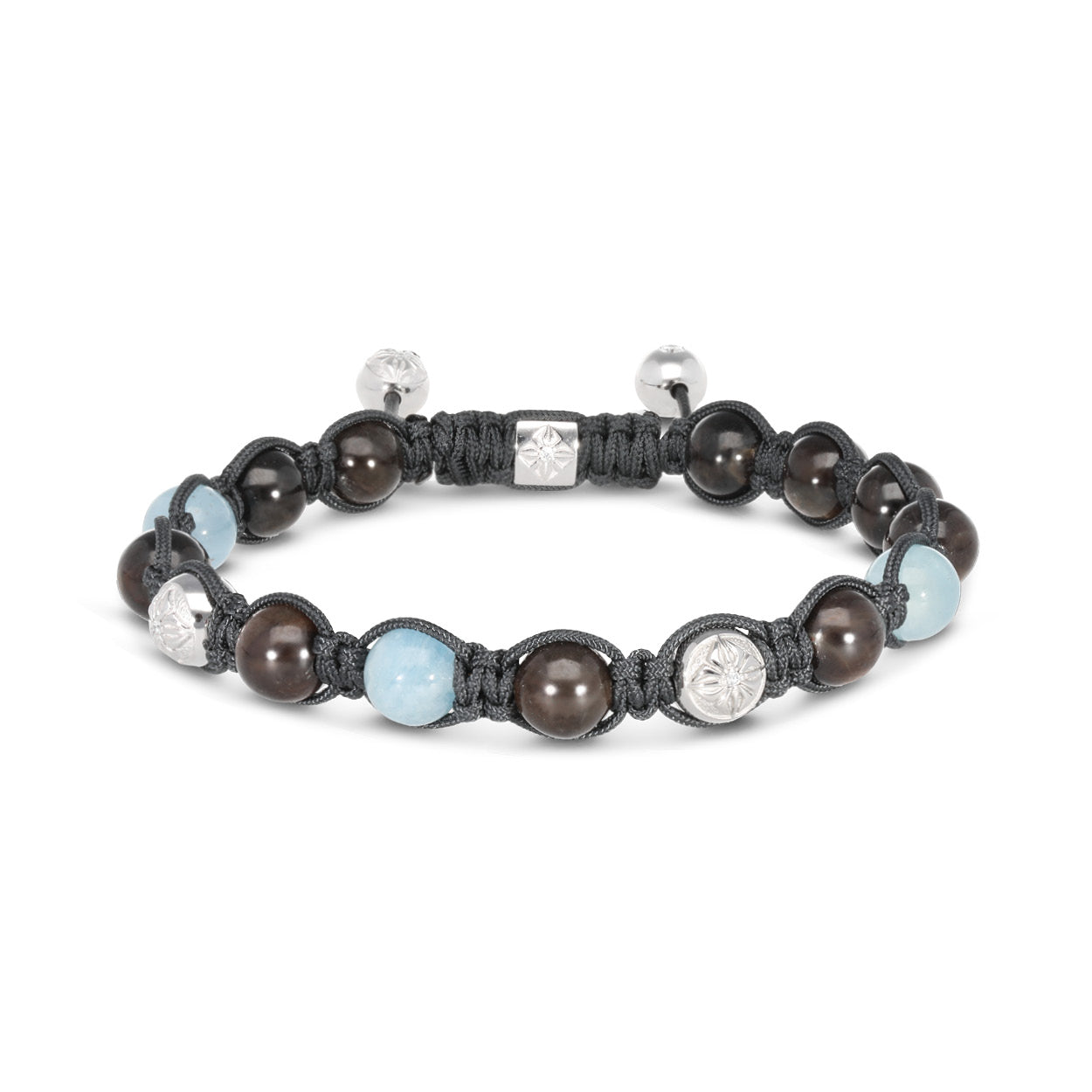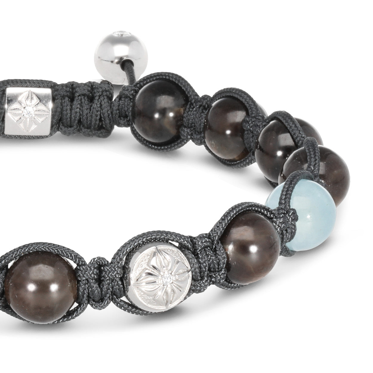 The 8mm SHAMBALLA® Braided Bracelet combines a stunning array of G/Vs Diamonds, Brown Sapphires, and Milky Aquamarines, all set in luxurious Platinum. Finished with a Charcoal Grey string, this piece exudes a refined, sophisticated charm perfect for making a statement.