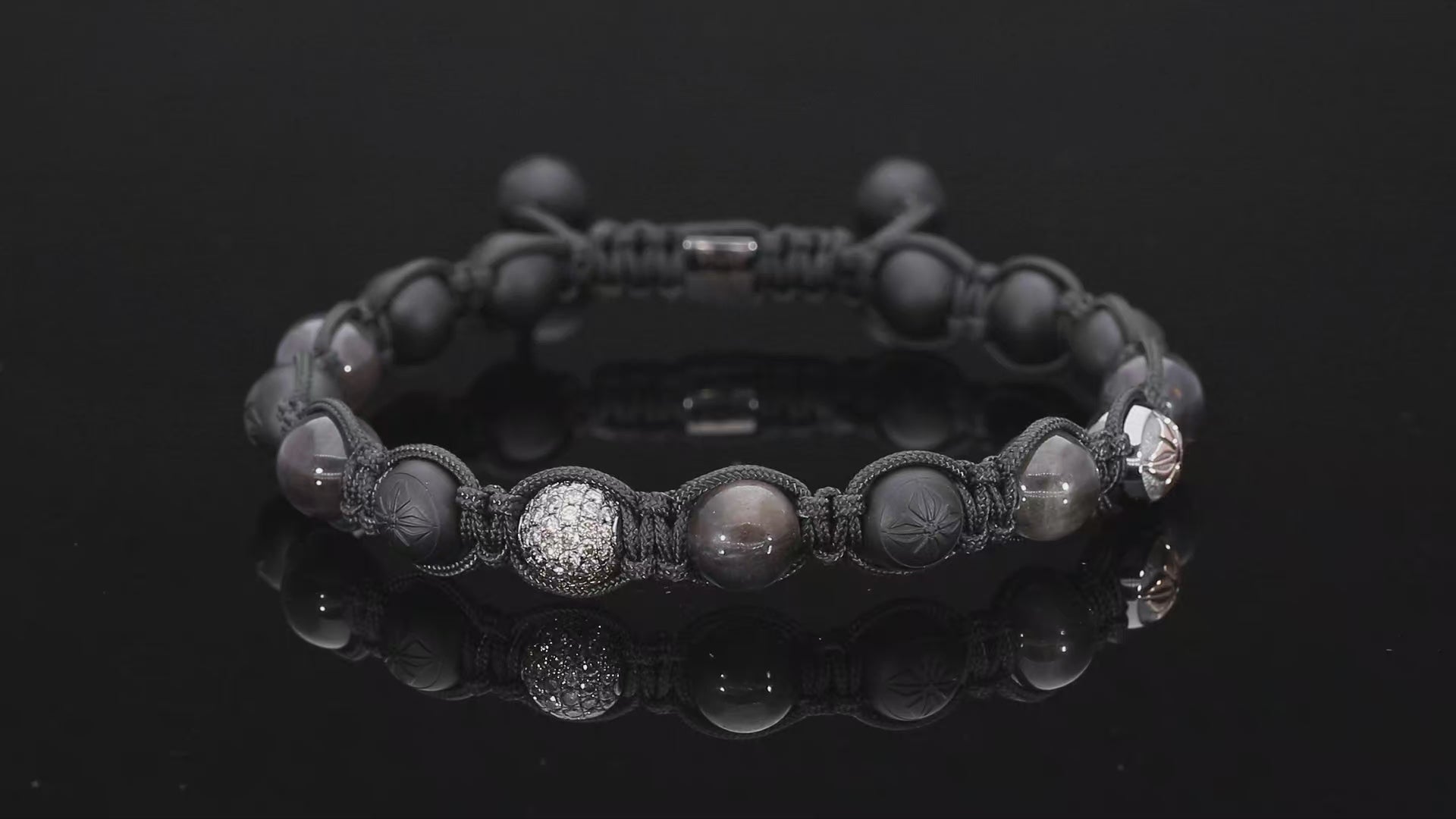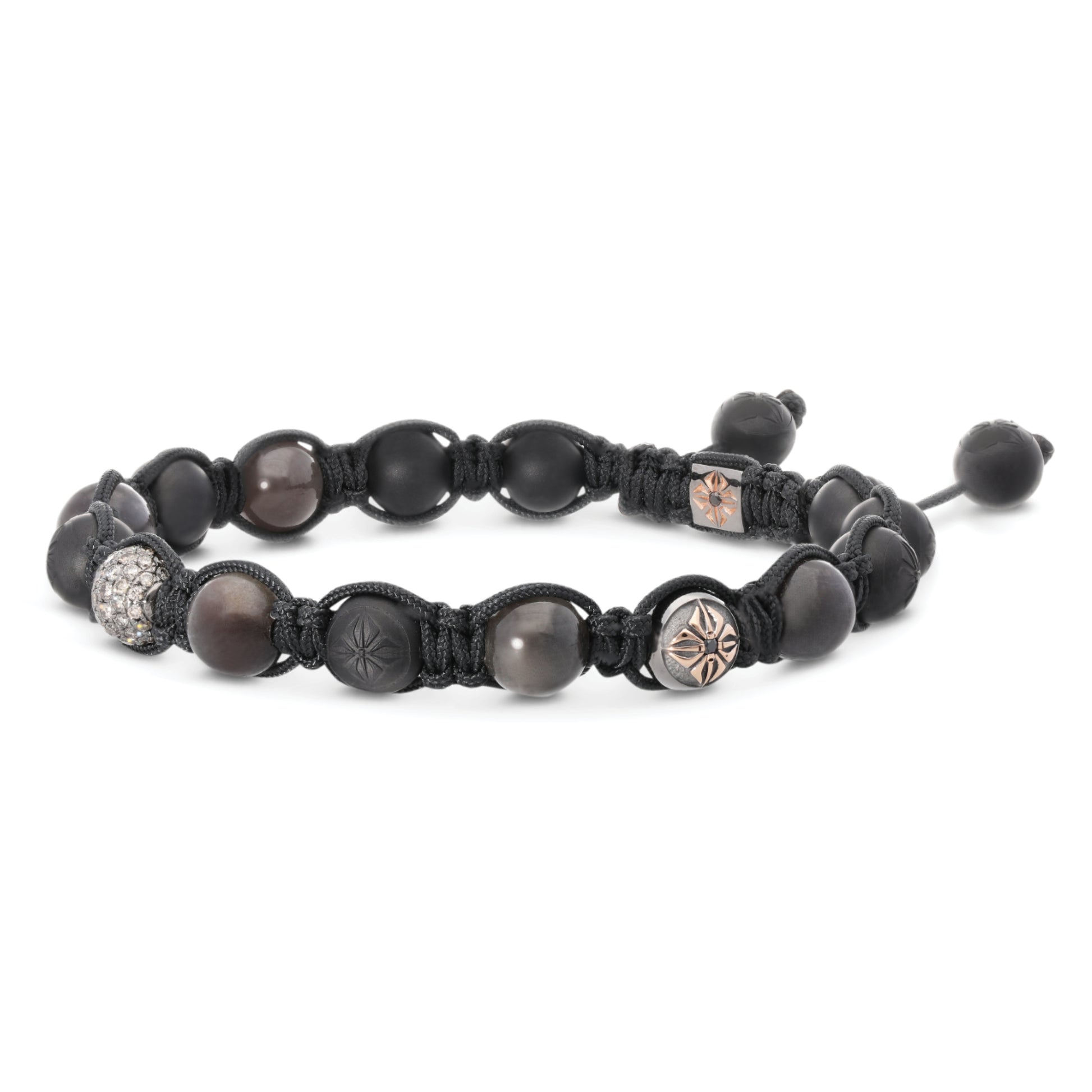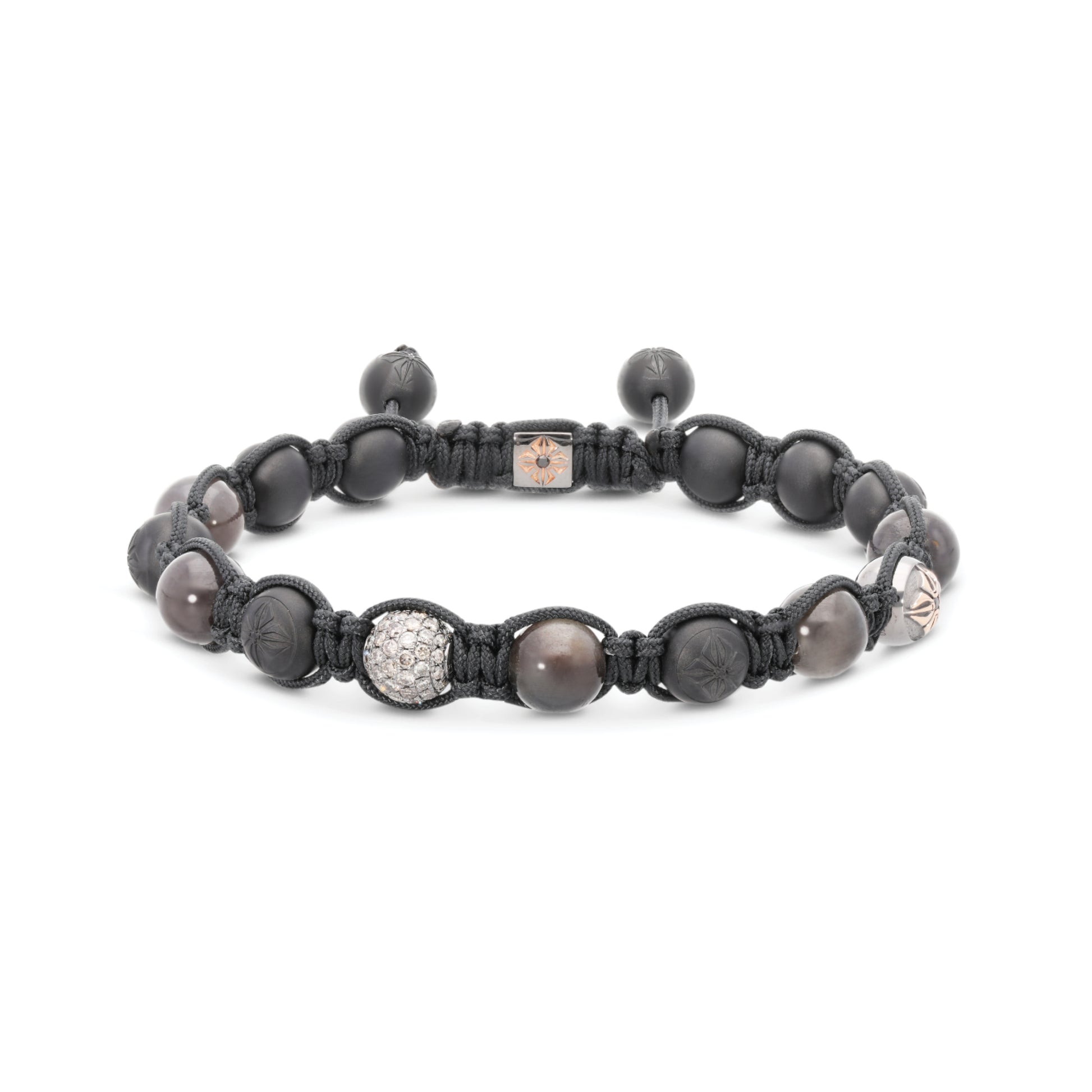 Sleek and dimensional, the 8mm SHAMBALLA® Braided Bracelet balances the warmth of rose gold veiled in black rhodium with a palette that moves from smoke to shadow. Brown and black diamonds add layered brilliance, grey sapphires lend cool restraint, and black matte ceramic introduces a modern, light-absorbing texture. Braided on a Charcoal Grey string, the silhouette feels refined yet understated—quietly radiant on its own and confident in a stack, and fully customizable in Creator.