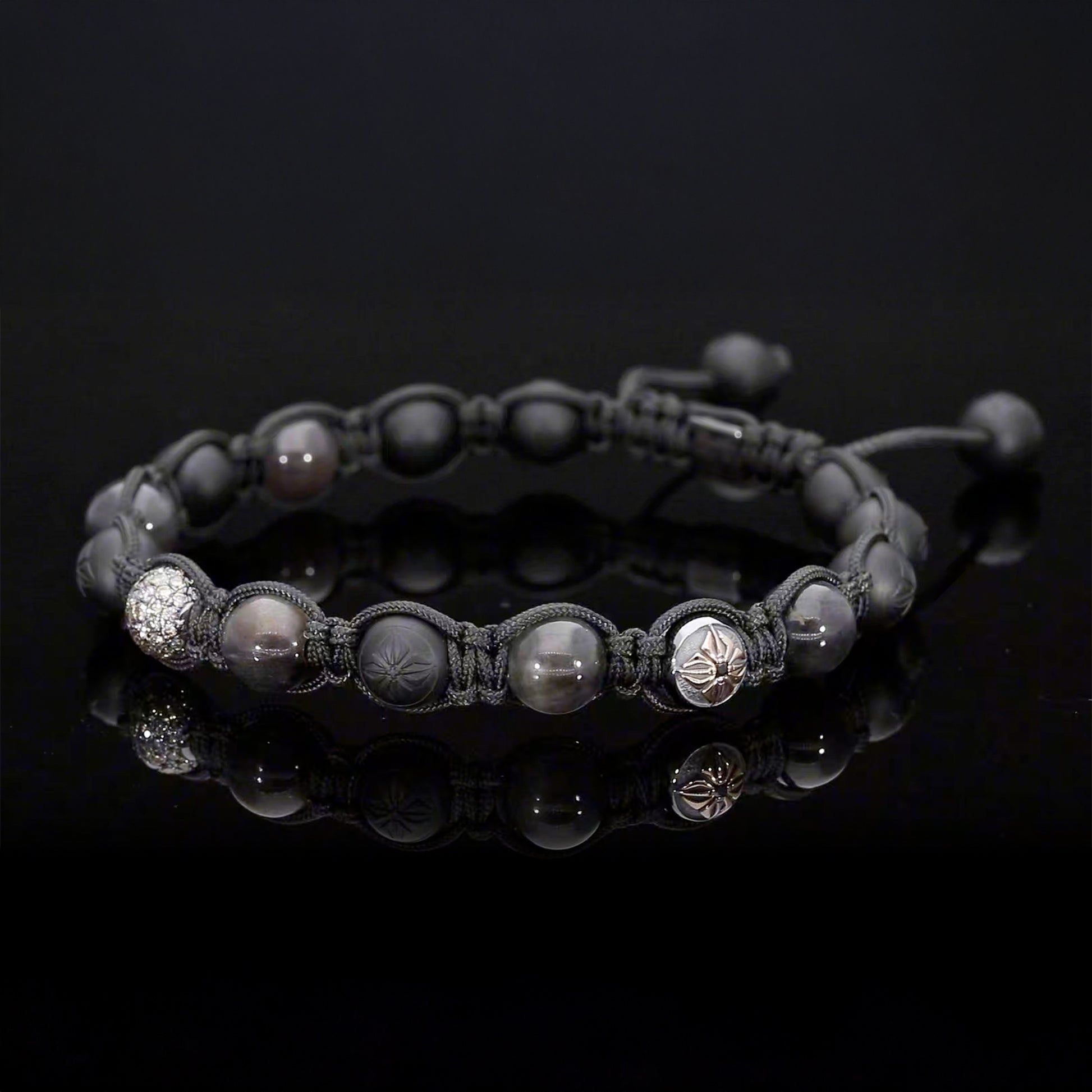 Sleek and dimensional, the 8mm SHAMBALLA® Braided Bracelet balances the warmth of rose gold veiled in black rhodium with a palette that moves from smoke to shadow. Brown and black diamonds add layered brilliance, grey sapphires lend cool restraint, and black matte ceramic introduces a modern, light-absorbing texture. Braided on a Charcoal Grey string, the silhouette feels refined yet understated—quietly radiant on its own and confident in a stack, and fully customizable in Creator.