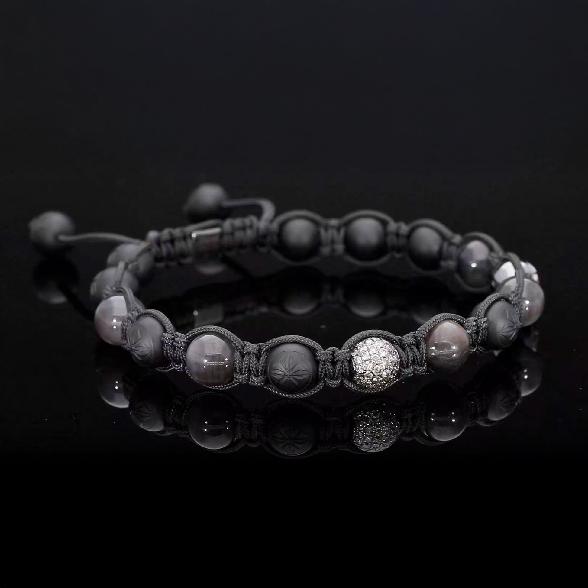 A durable, hand-braided string chosen for long-wear comfort and strength. Its Charcoal Grey tone is a color expression—not a metal—selected to echo the rhodium finish and refine the bracelet’s modern profile.