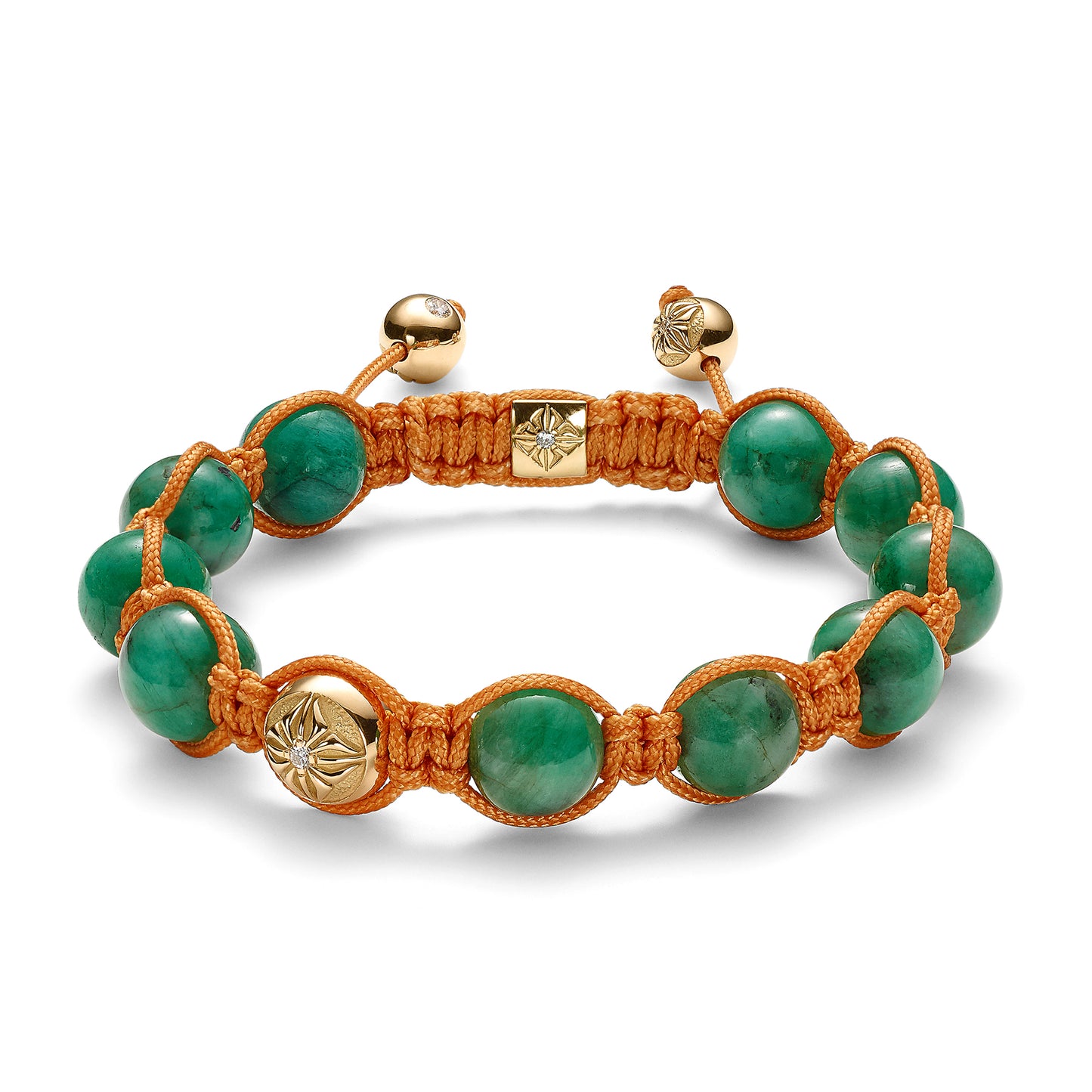 Just like the wings of an exotic parrot, this creations is rich in intense green Emeralds, vivid Orange String and 18k Yellow Gold with White Diamonds that resembles the beaming Sun. Every component as well as the string color can be changed and customized in Creator.