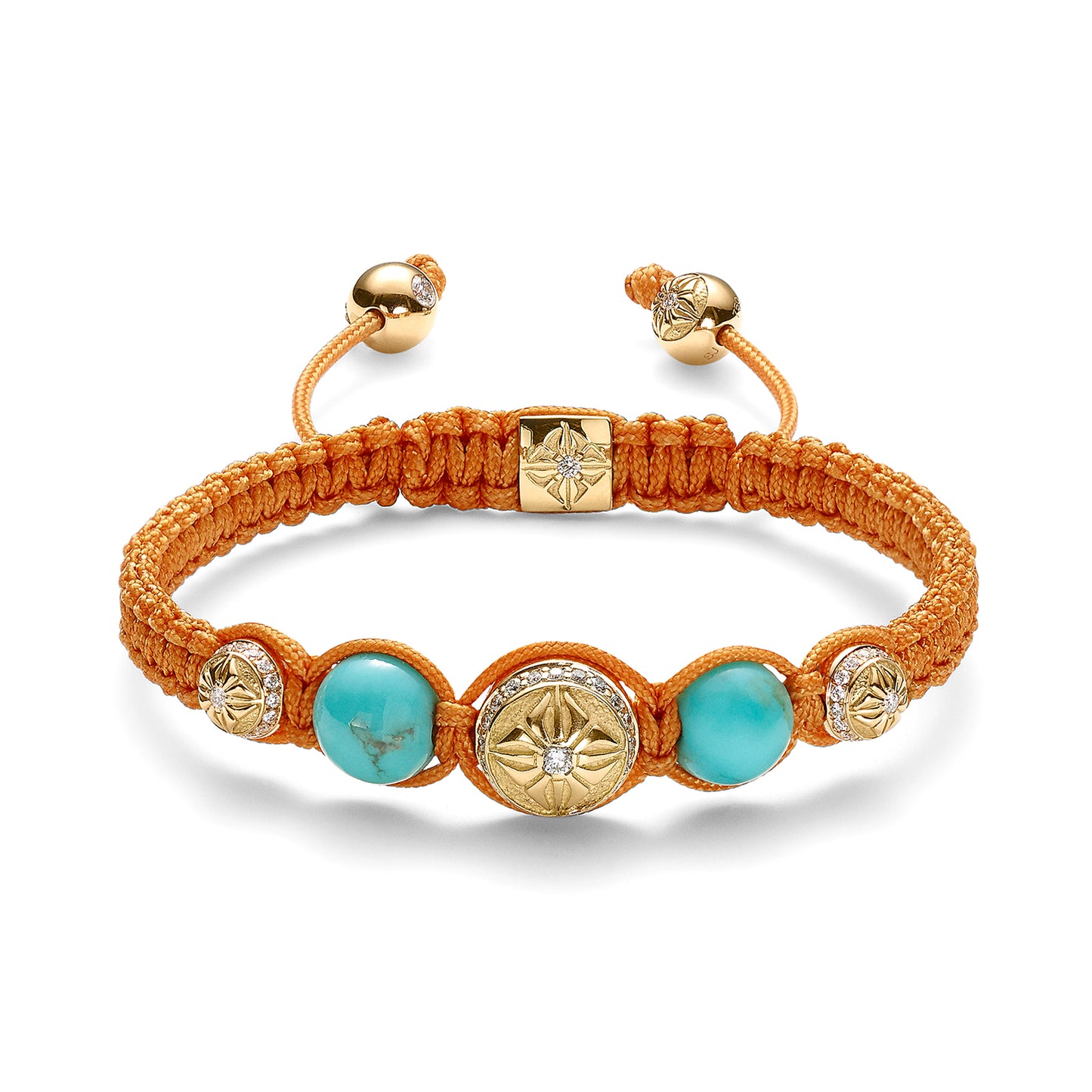 As an epitome to the sunlit tropics, ripe fruit and turquoise lagoons, this creations pulses in great energy. Eye-catching turquoises blend with intense Orange String, just to beautifully reflect on the surface of 18k Yellow Gold with White Diamonds. Every component as well as the string color can be changed and customized in Creator.
