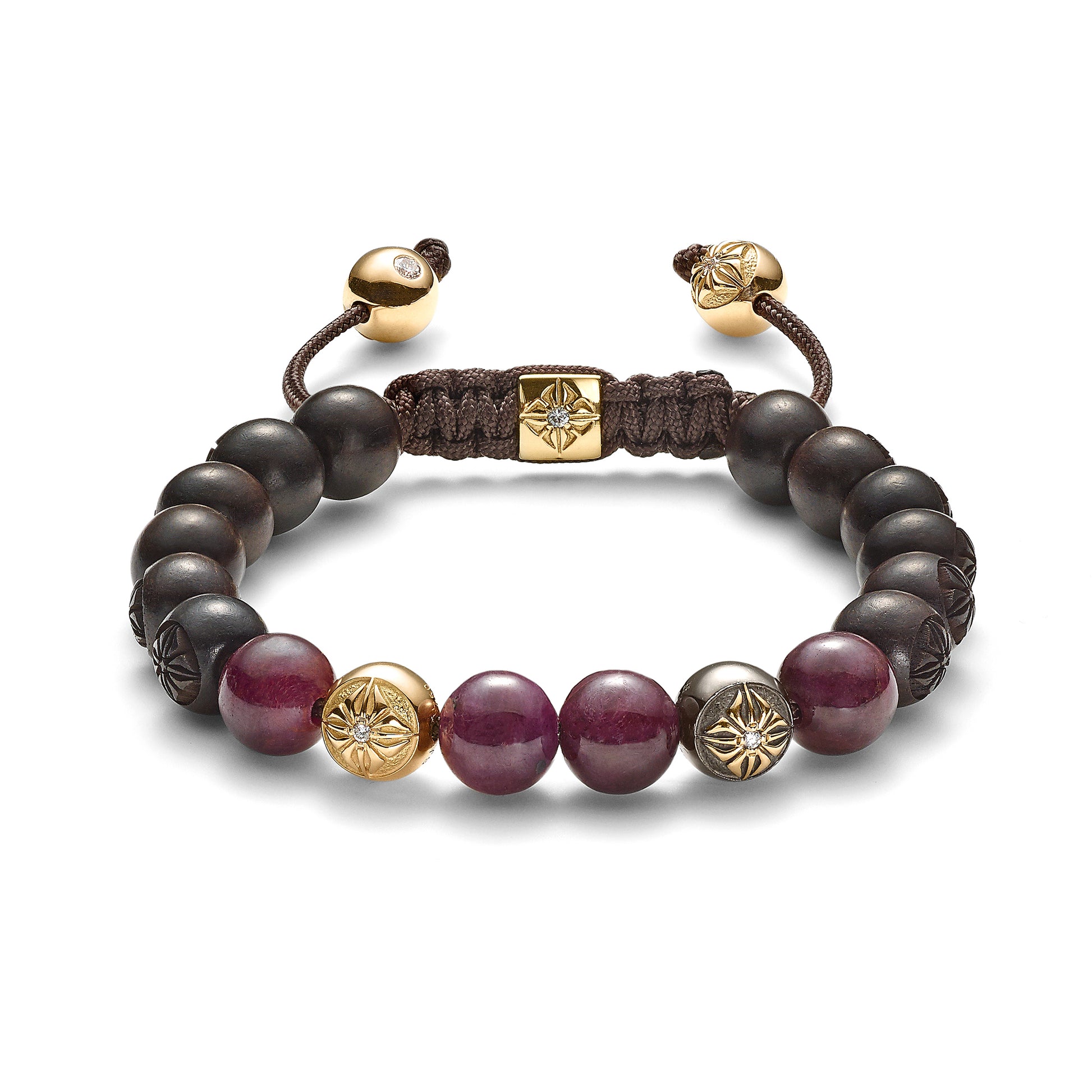 An adventurous design that balances between the darker shades of the color wheel. Rubies and Ebonies play a tone-in-tone game in this beautiful design. As both find themselves on the warmer side of the color palette, they perfectly complete each other, only to be occassionally met with the opulence of 18k Yellow & Black-Rhodinated Gold with White Diamonds. Every component as well as the string color can be changed and customized in Creator.