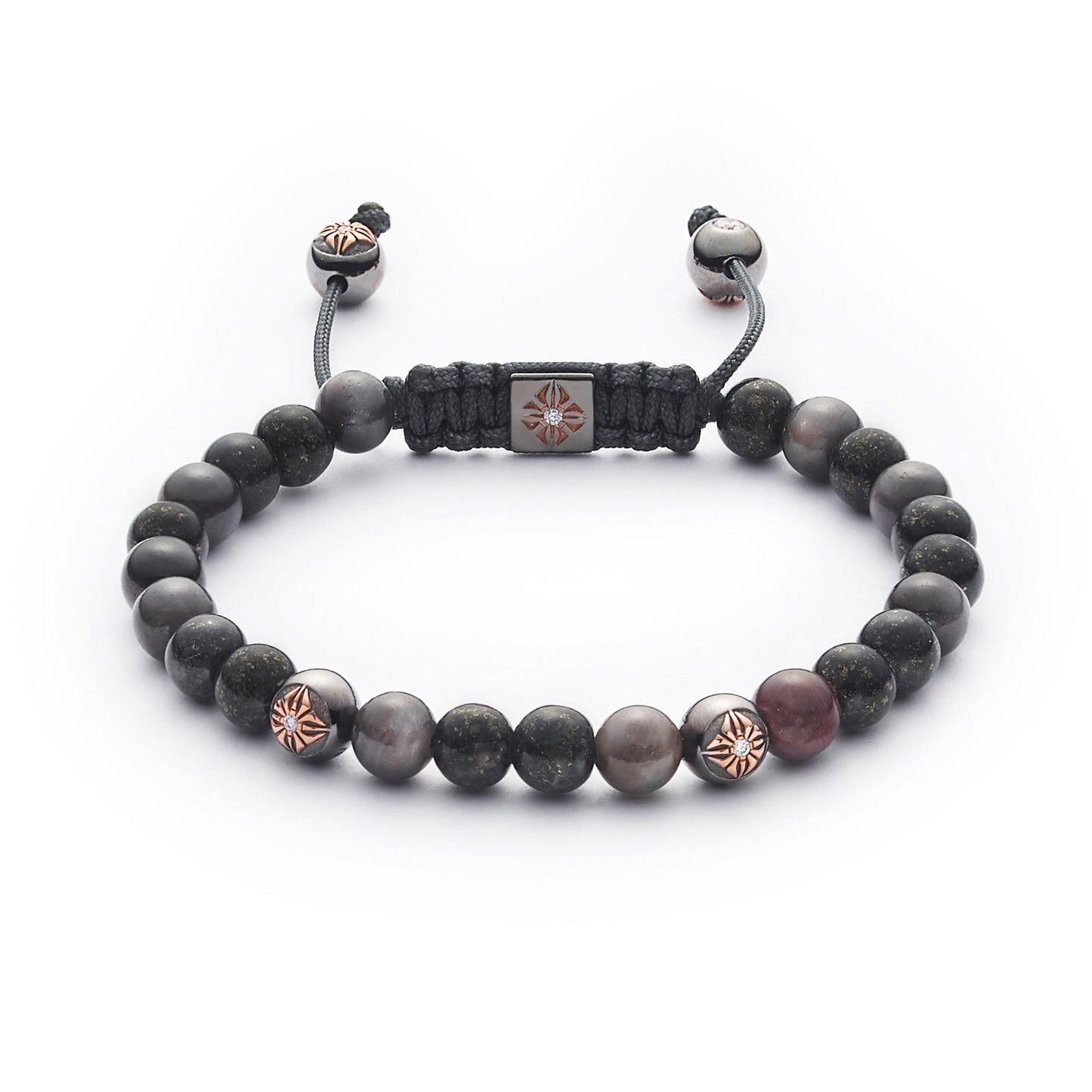 In this SHAMBALLA® Non-Braided Bracelet, the mysteriously dark palette of precious stones is celebrated - Grey Sapphires, Black Jade or Ruby, just to be complemented with the luxury of Rose & Black Rhodinated Gold. Every component as well as the string color can be changed and customized in Creator.