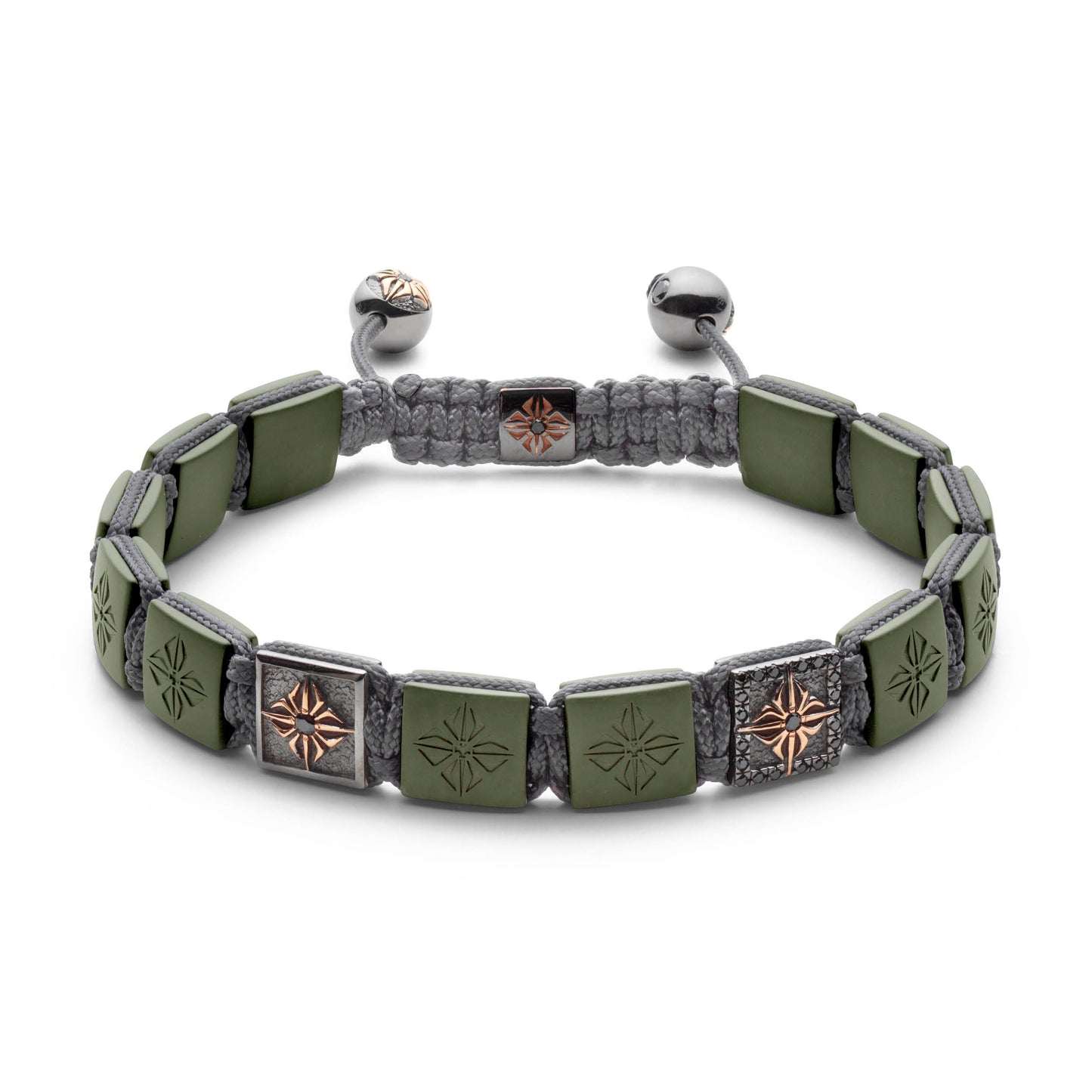 Charcoal Grey String: The bracelet is elegantly finished with a charcoal grey string, providing a sophisticated backdrop that complements the dark hues of the diamonds, ceramic, and gold. The string is meticulously woven for durability and comfort, ensuring a perfect fit and luxurious feel.