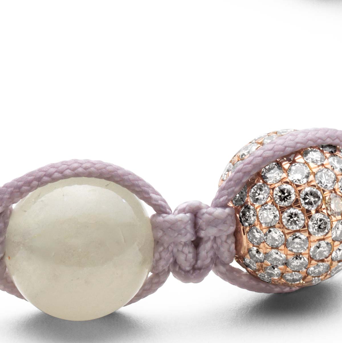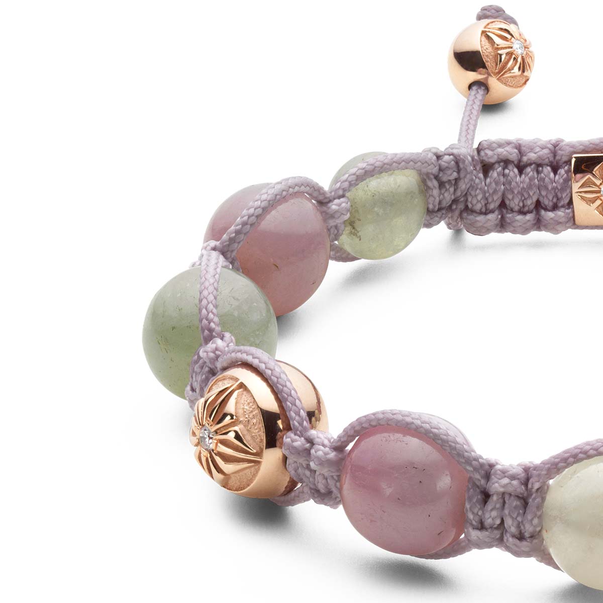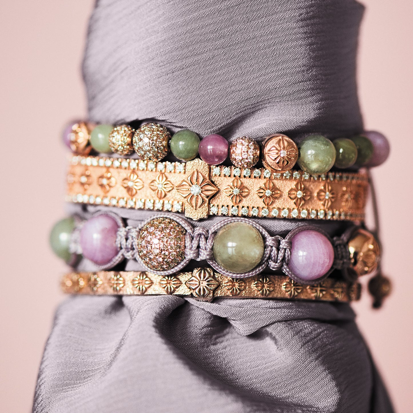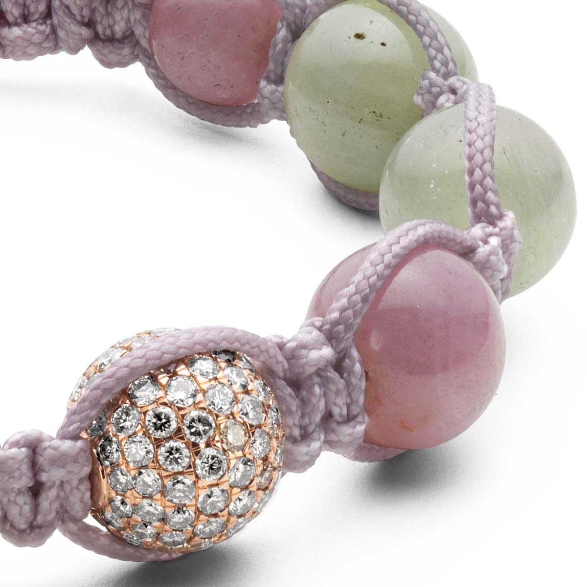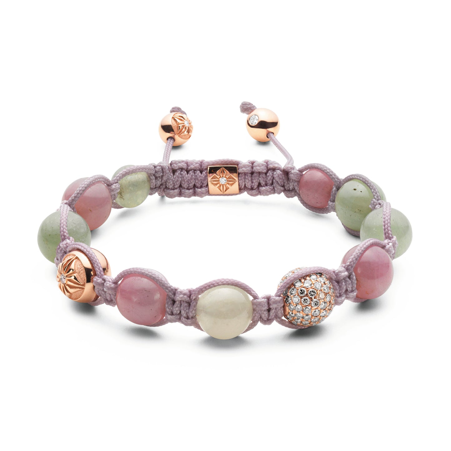 This SHAMBALLA® 10mm Braided Bracelet contains precious gemstones inspired by pastel colors. White & Brown Diamonds are precisely set into 18K Rose Gold, matched side by side with intense Pink and Green Sapphires.