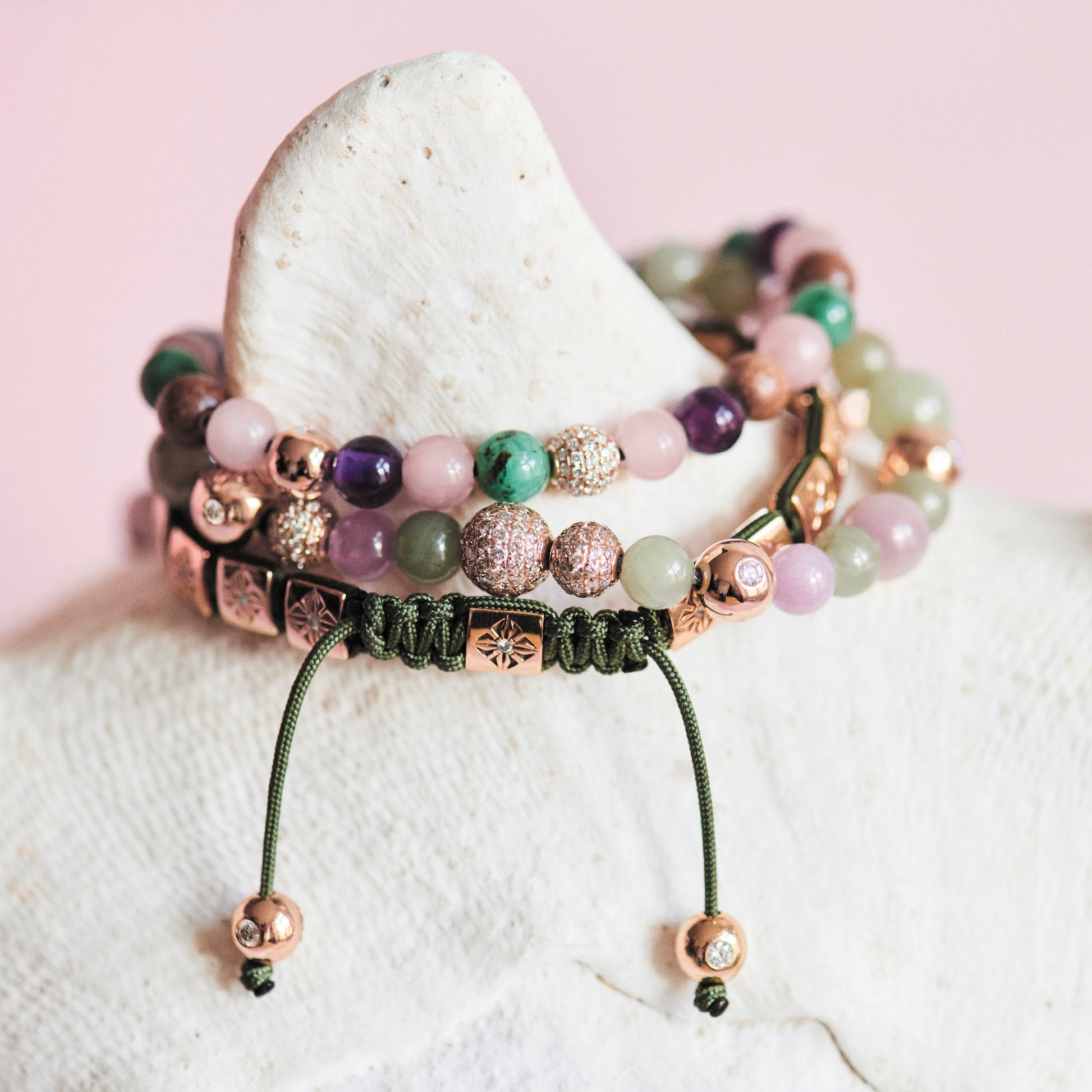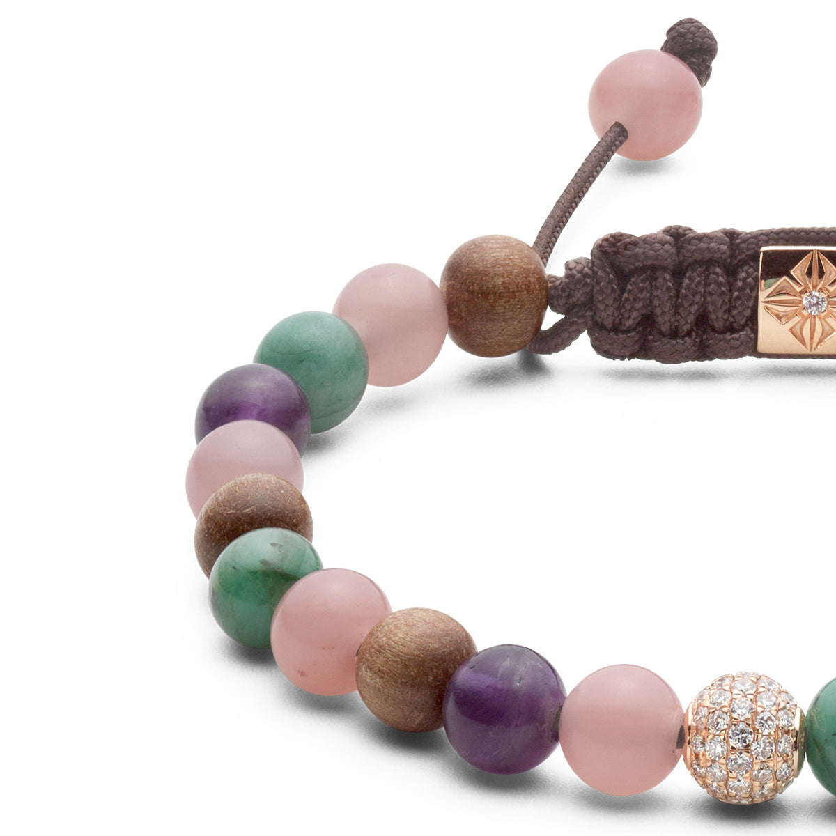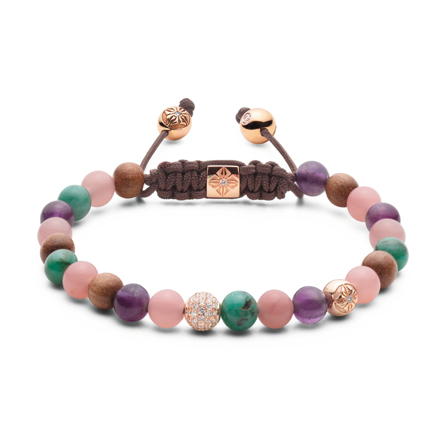 This SHAMBALLA® 6mm Non-Braided Bracelet contains precious gemstones inspired by pastel colors. White Diamonds are precisely set into 18K Rose Gold, matched side by side with intense Emeralds, Amethysts and Guava Quartzes.