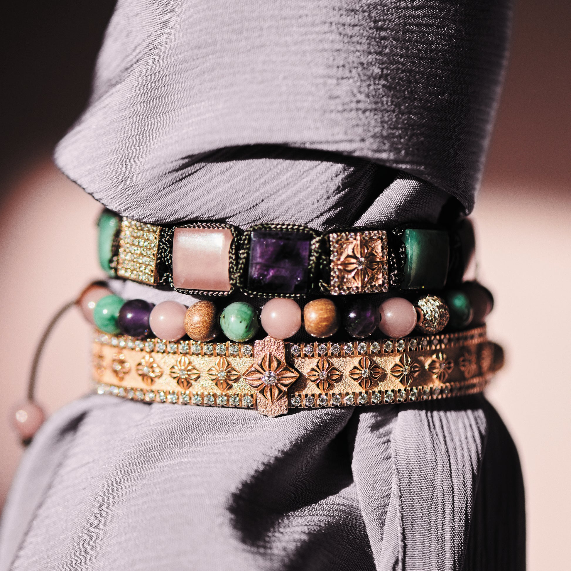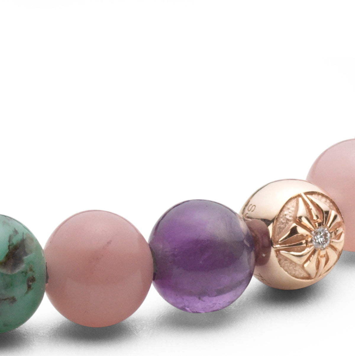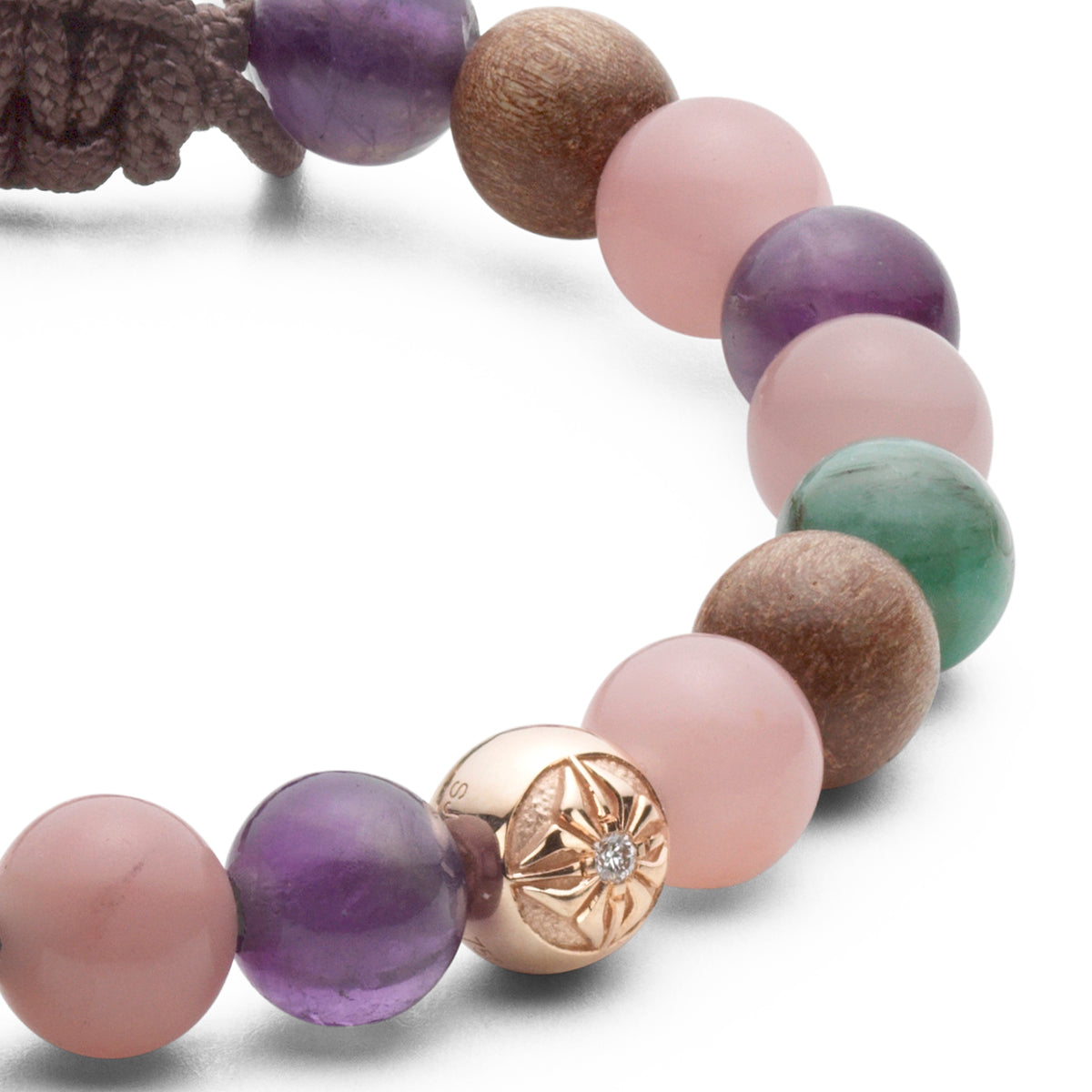 This SHAMBALLA® 6mm Non-Braided Bracelet contains precious gemstones inspired by pastel colors. White Diamonds are precisely set into 18K Rose Gold, matched side by side with intense Emeralds, Amethysts and Guava Quartzes.