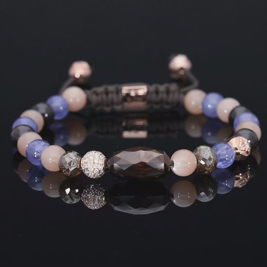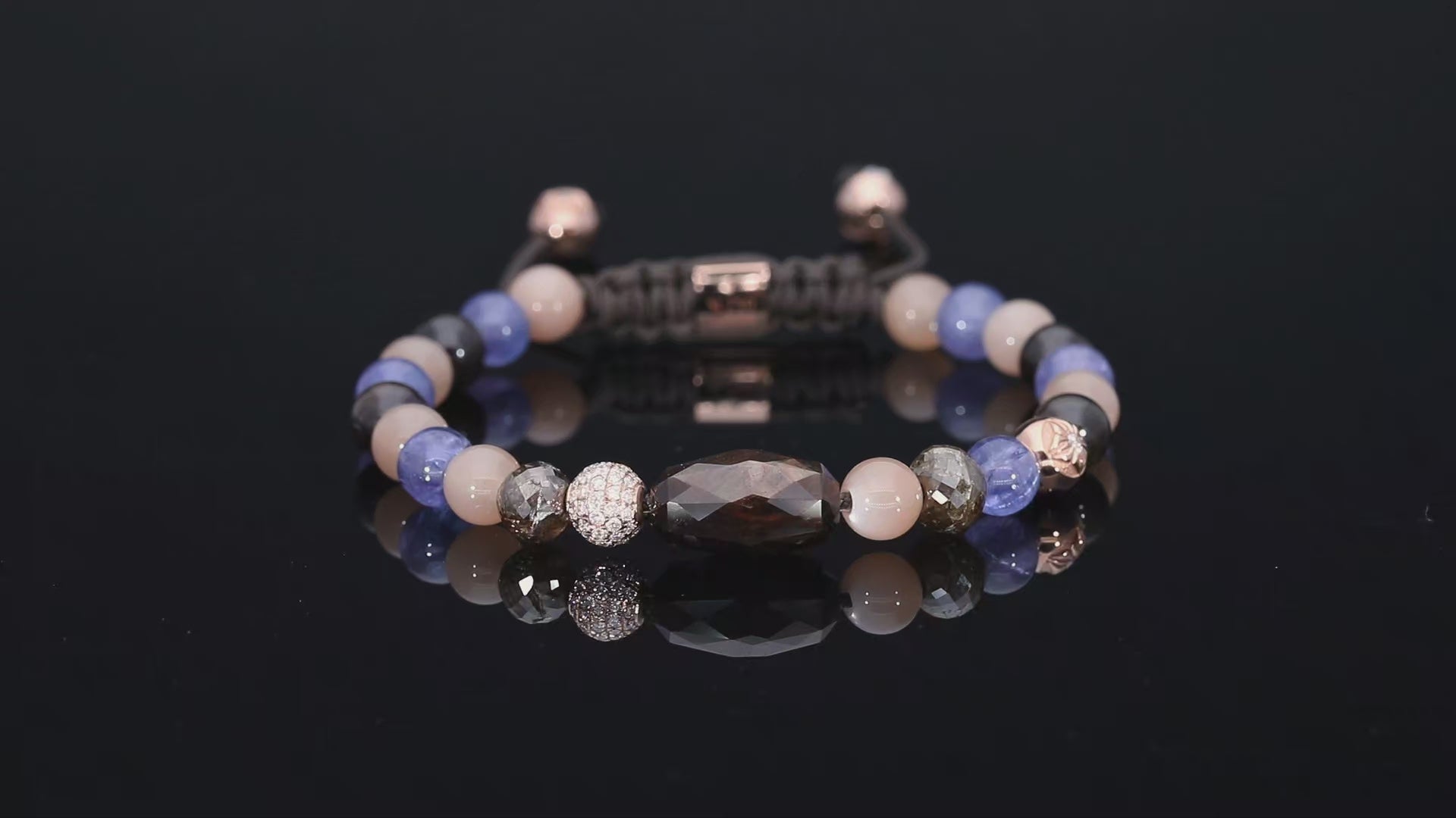 A refined play of scale and color, the Multisize SHAMBALLA® Non-Braided Bracelet pairs the warmth of 18K rose gold with a nuanced spectrum of gemstones. Alternating bead sizes create a rhythmic silhouette that sits sleekly on the wrist, while the Dusty Brown string grounds the composition with an understated, earthy tone. Cognac-hued brown diamonds and sapphires glow against crisp G/Vs diamonds, with tanzanites lending cool blue-violet lift and peach moonstones adding a soft, luminous sheen. The result is a contemporary profile—quietly radiant alone, striking in a stack.