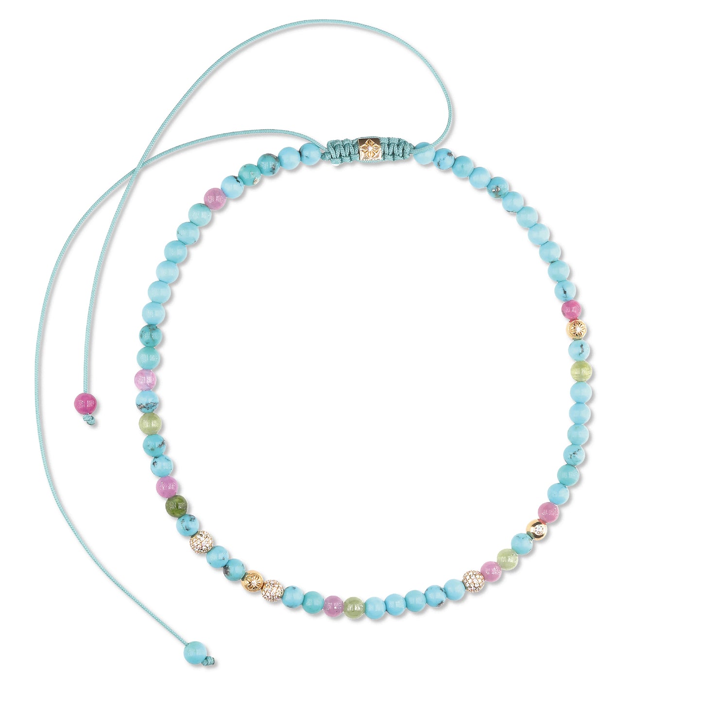G/Vs Diamonds, Pink Greenland & Green Sapphires, Turquoises, 18K Yellow Gold.